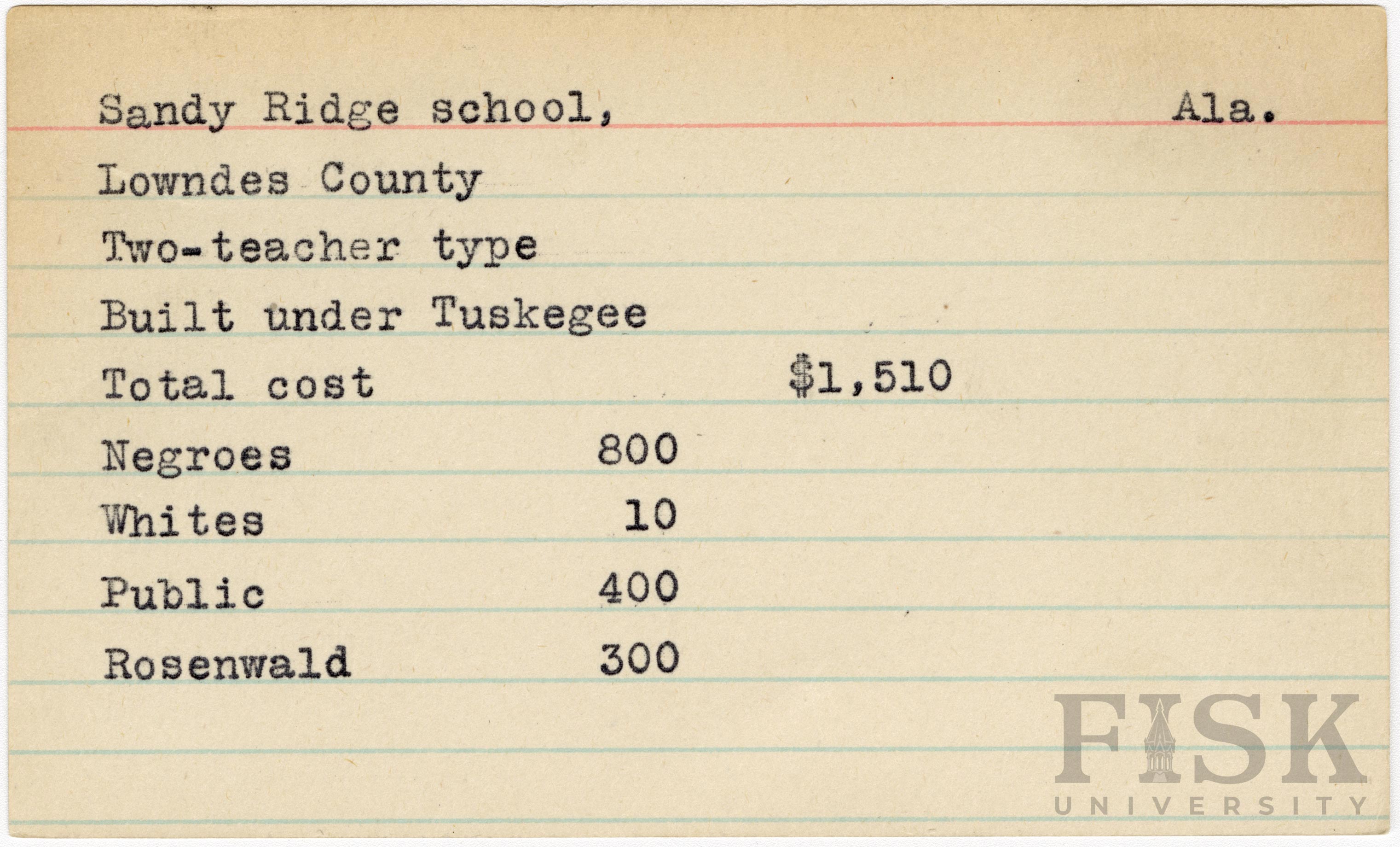 - School card from Rosenwald Fund for Sandy Ridge School in Lowndes County, Alabama