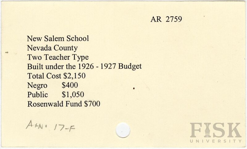 - School card from Rosenwald Fund for New Salem School in Nevada County, Arkansas