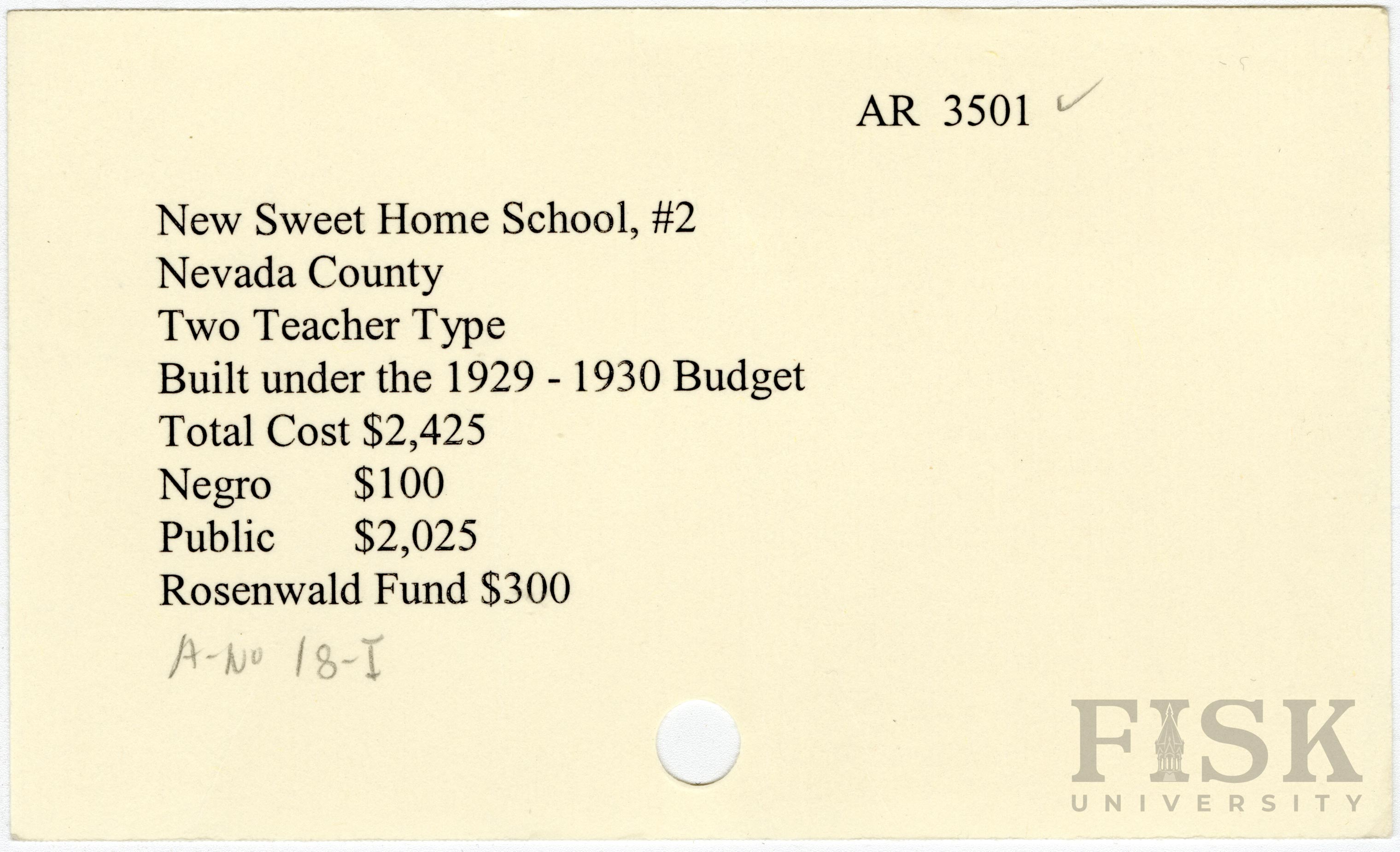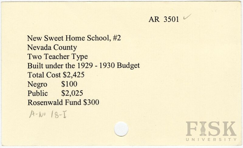 - School card from Rosenwald Fund for New Sweet Home School No. 2 in Nevada County, Arkansas