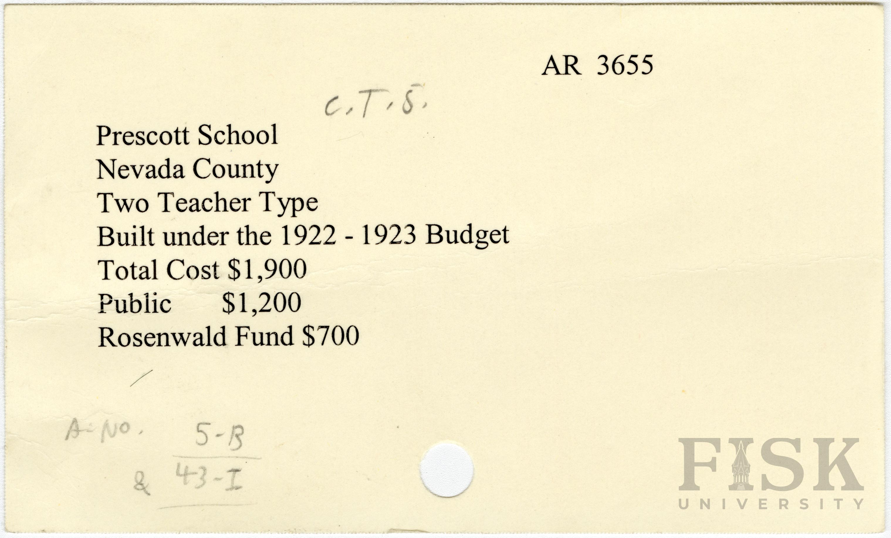 - School card from Rosenwald Fund for Prescott School in Nevada County, Arkansas