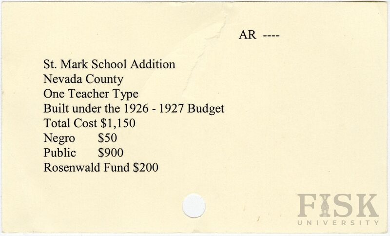 - School card from Rosenwald Fund for an addition to St. Mark School in Nevada County, Arkansas