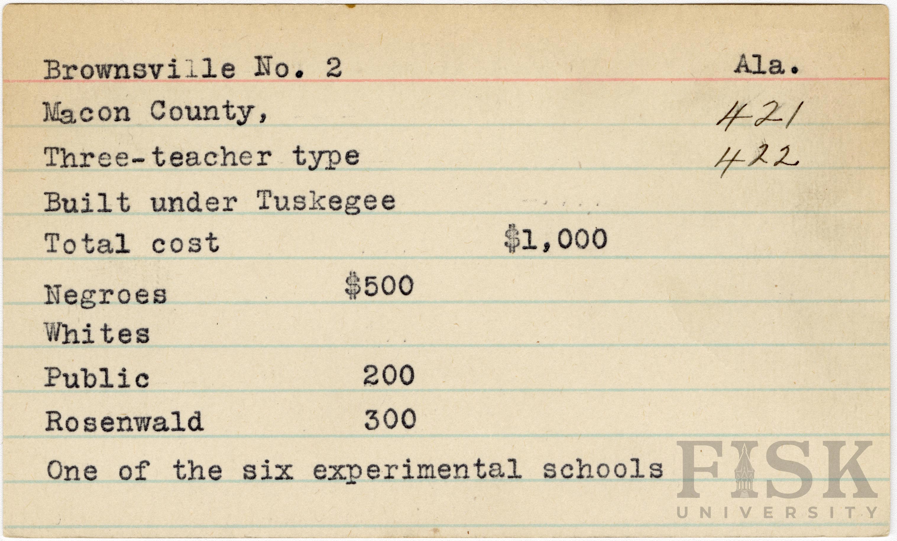 - School card from Rosenwald Fund for Brownsville School No. 2 in Macon County, Alabama with a note at the bottom that says, "One of the six experimental schools"