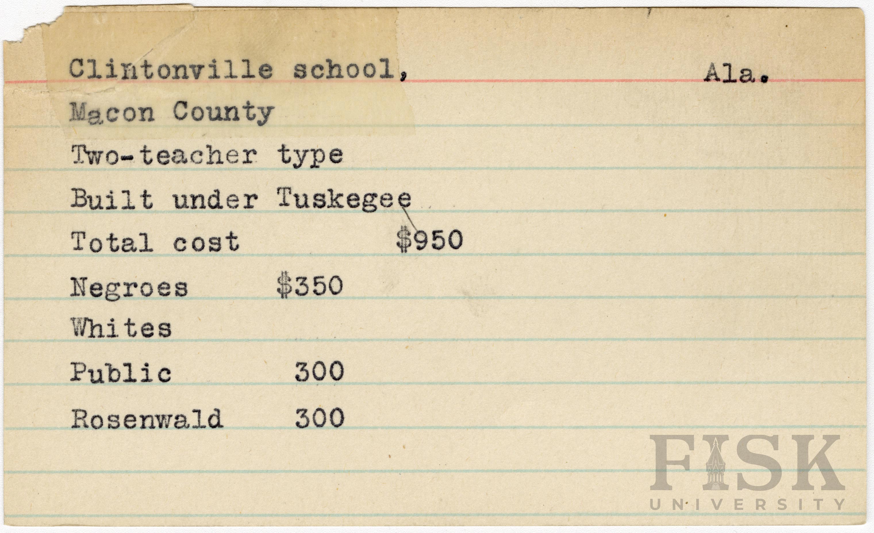 - School card from Rosenwald Fund for Clintonville School in Macon County, Alabama