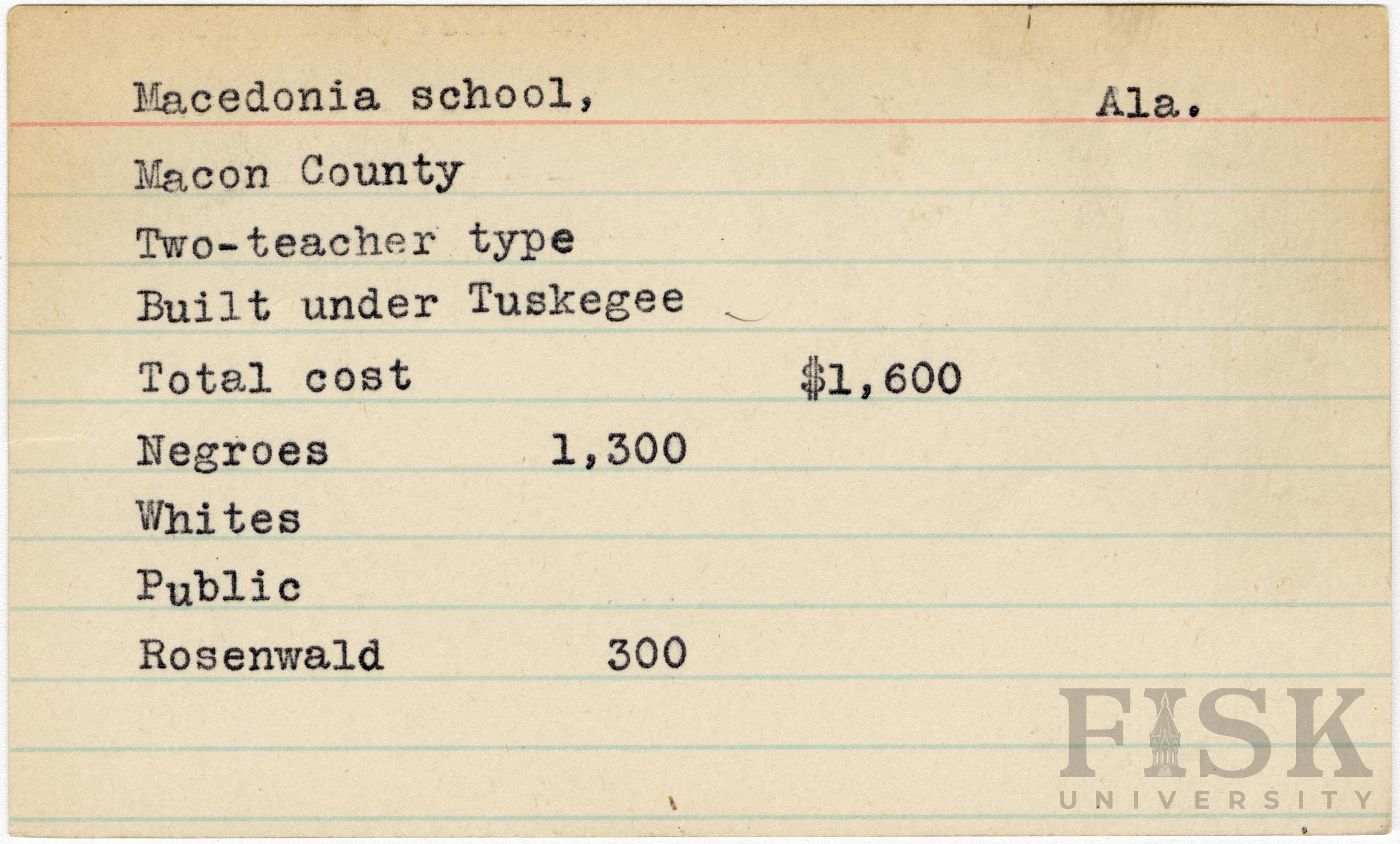 - School card from Rosenwald Fund for Macedonia School in Macon County, Alabama