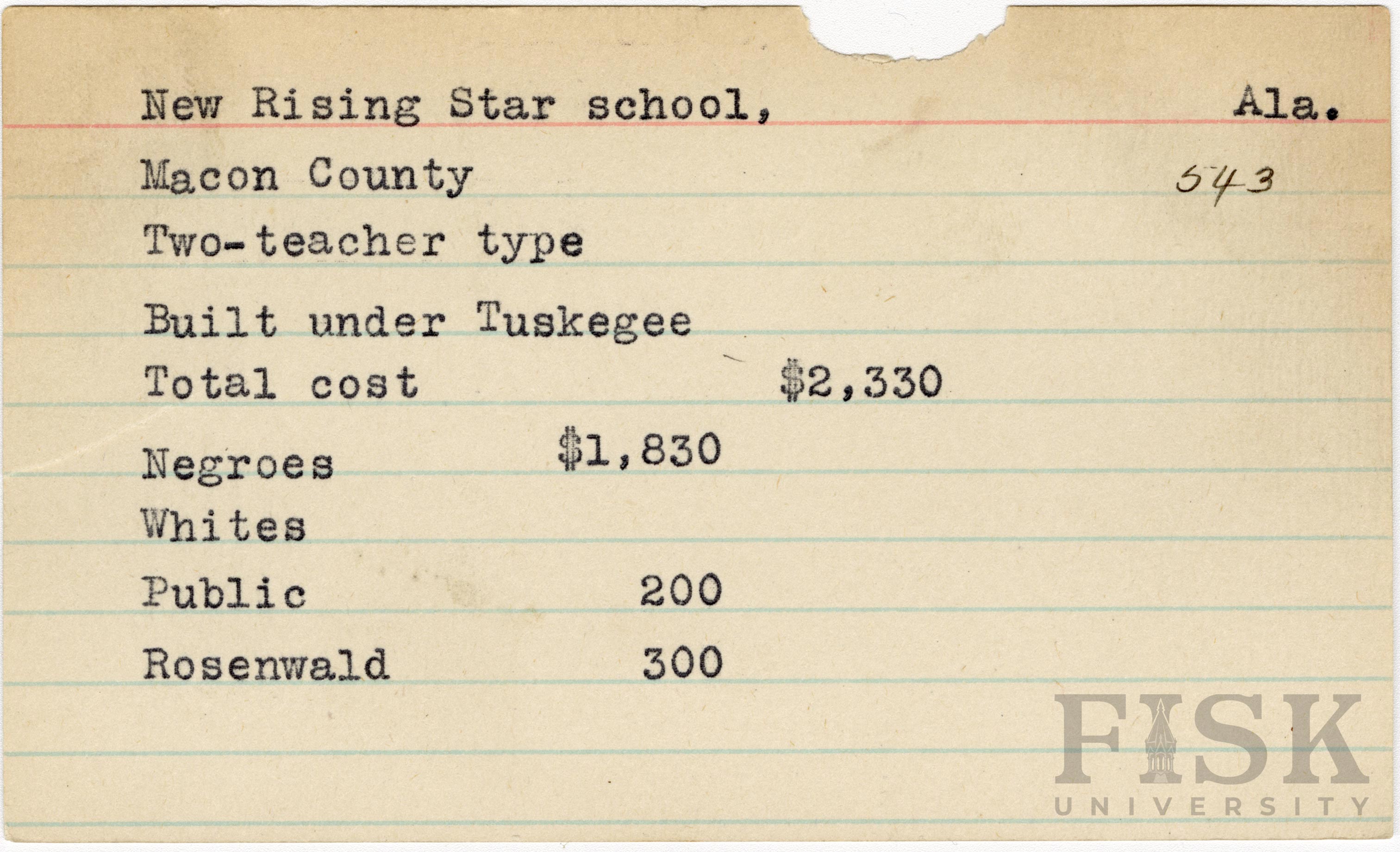- School card from Rosenwald Fund for New Rising Star School in Macon County, Alabama