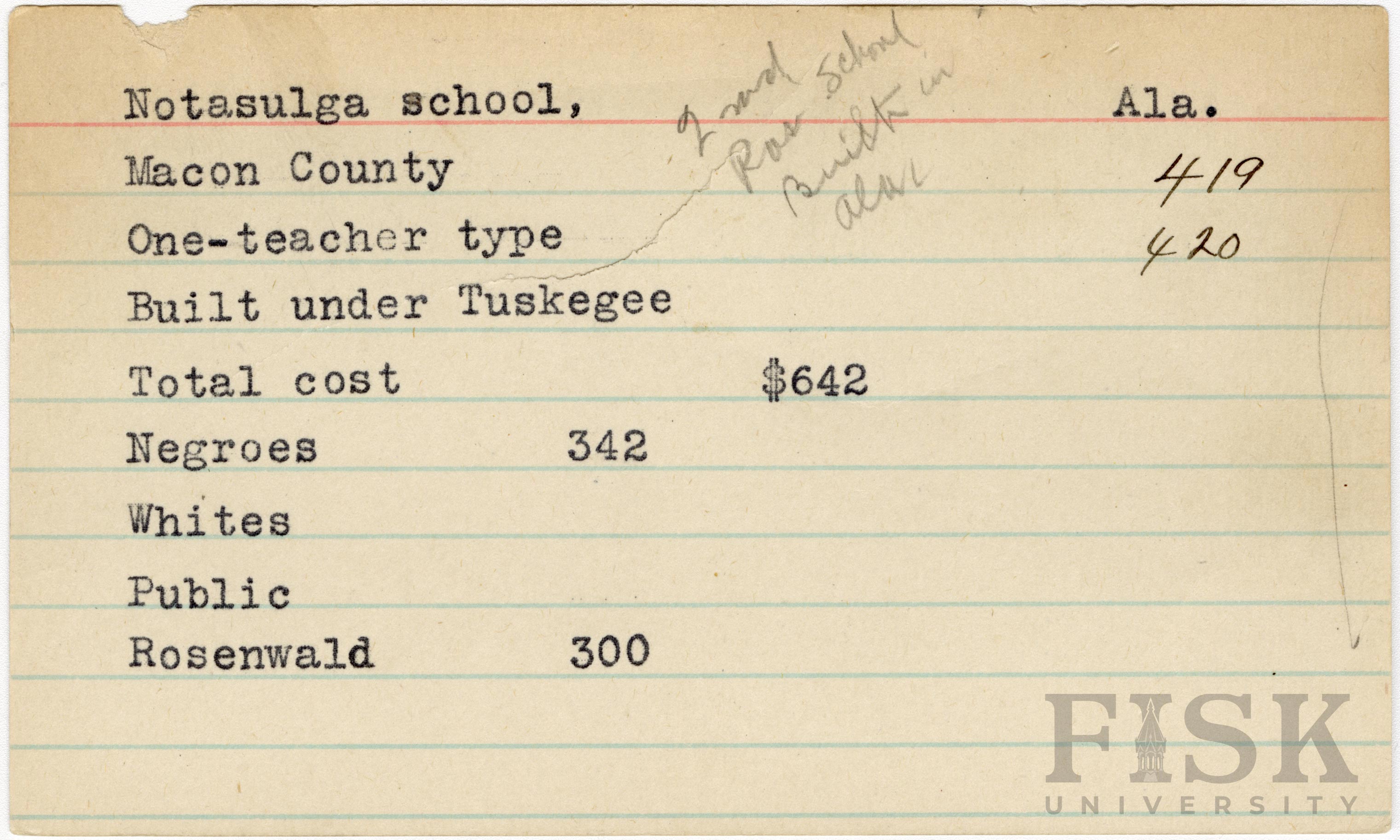 School card from Rosenwald Fund for Notasulga School in Macon County, Alabama with a handwritten note that says, "2nd Ros school built in Ala"