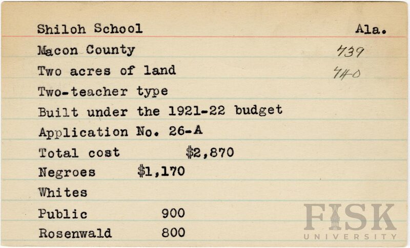 - School card from Rosewnald Fund for Shiloh School in Macon County, Alabama