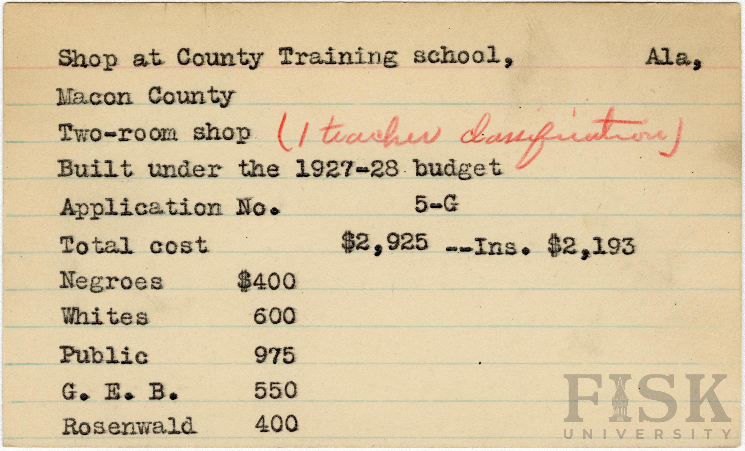 School card from Rosenwald Fund for the two-room shop at Thrasher School in Macon County, Alabama with two sections added to the budget contributions that say, "Ins. $2,193" and "G.E.B. $550"