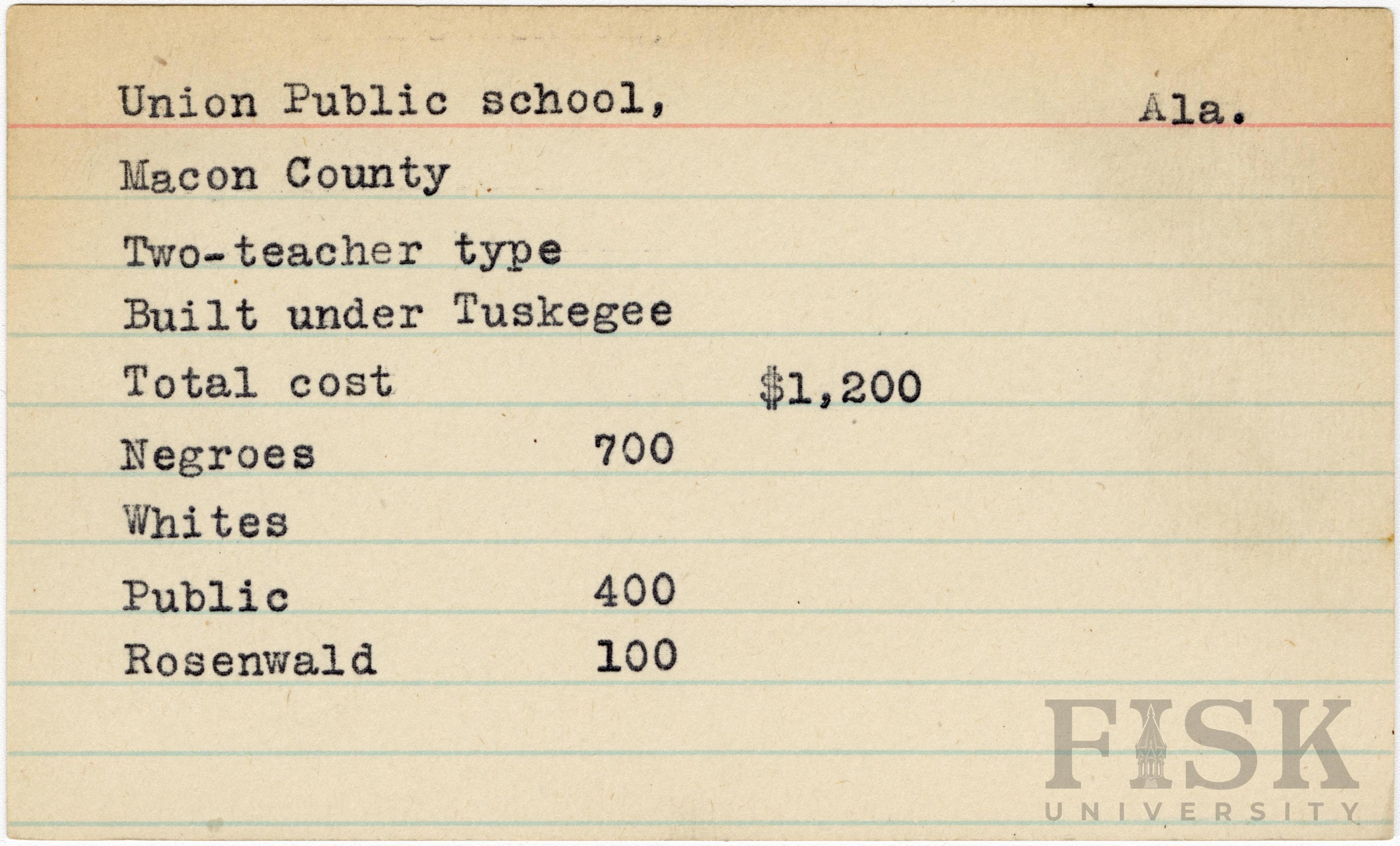 School card from Rosenwald Fund for Union Public School in Macon County, Alabama