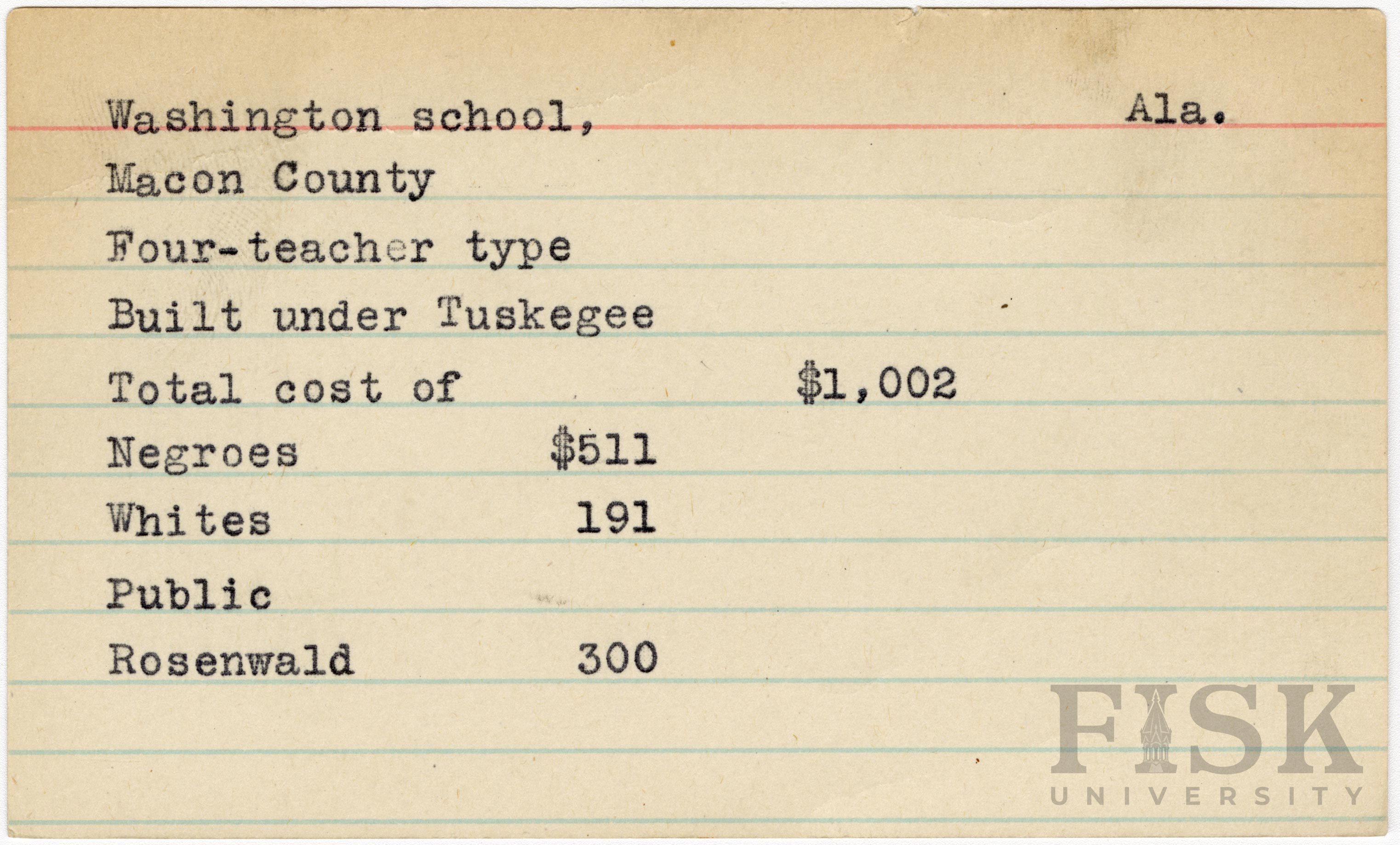 - School card from Rosewnald Fund for Washington School in Macon County, Alabama