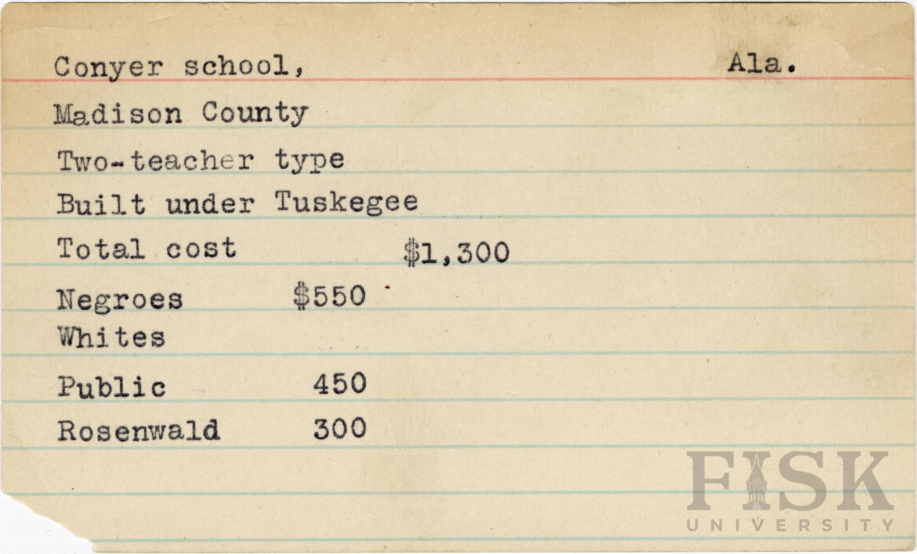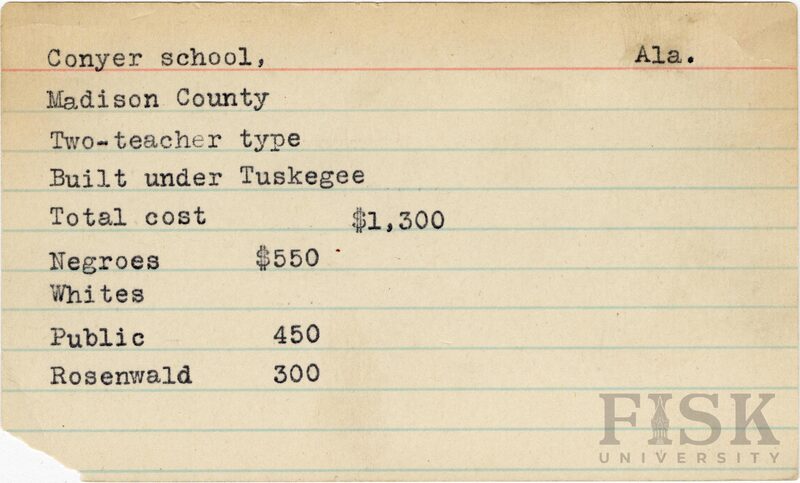 - School card from Rosenwald Fund for Conyer School in Madison County, Alabama