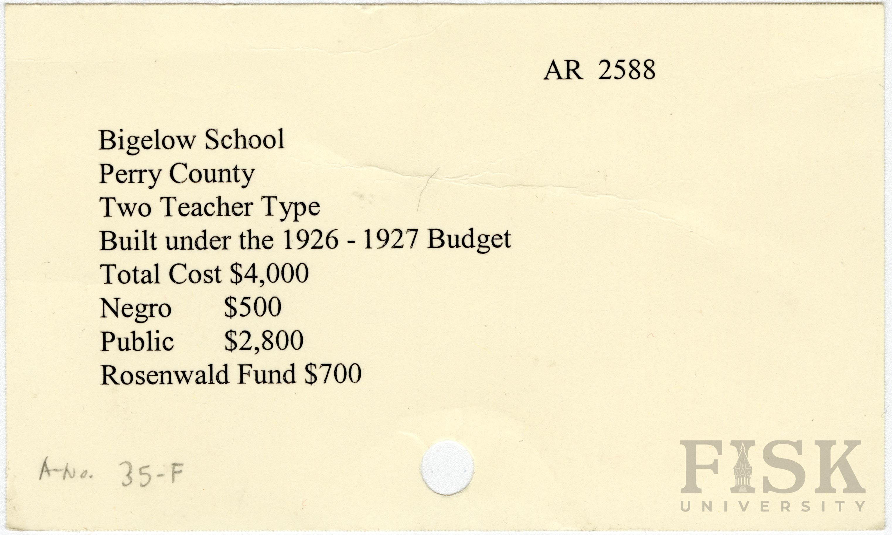 - School card from Rosenwald Fund for Bigelow School in Perry County, Arkansas