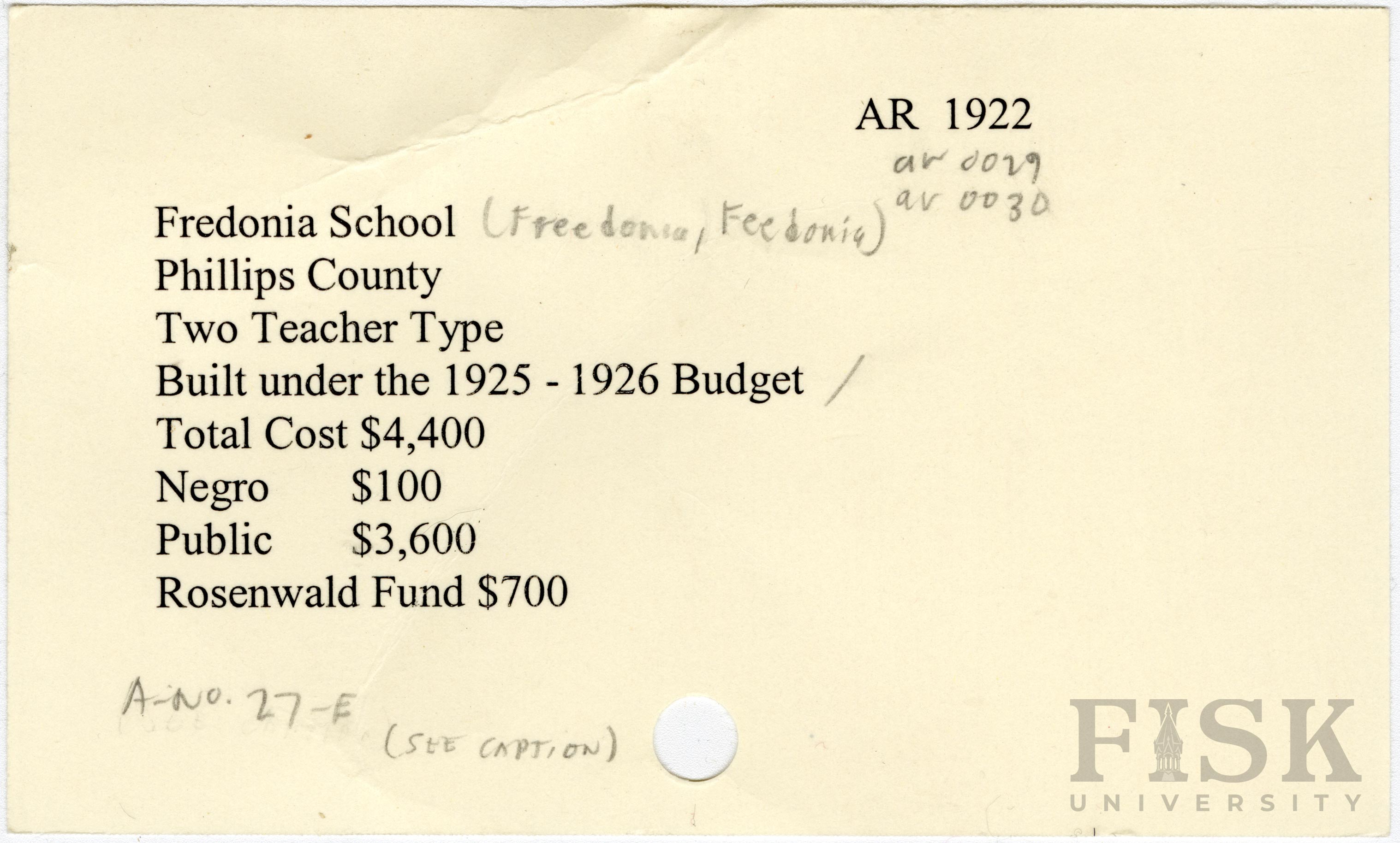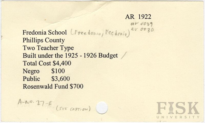 - School card from Rosenwald Fund for Fredonia School in Phillips County, Arkansas