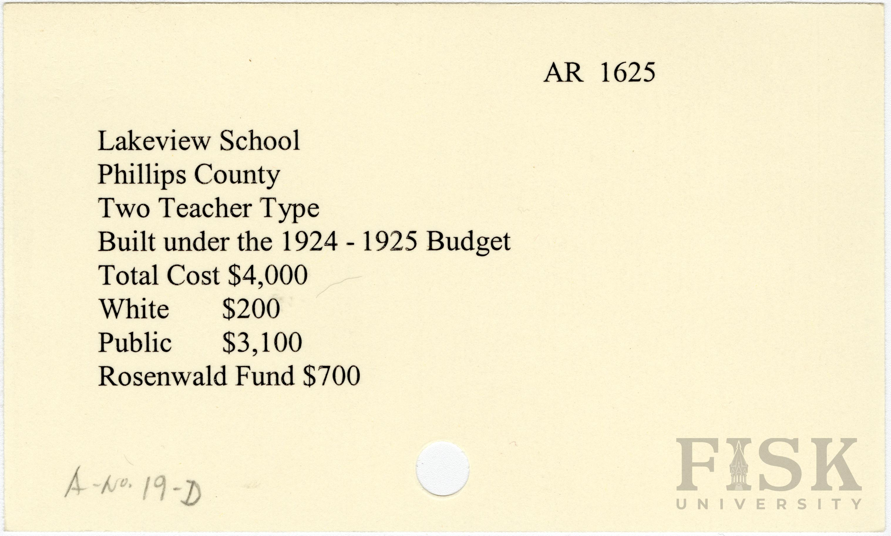 - School card from Rosenwald Fund for Lakeview School in Phillips County, Arkansas