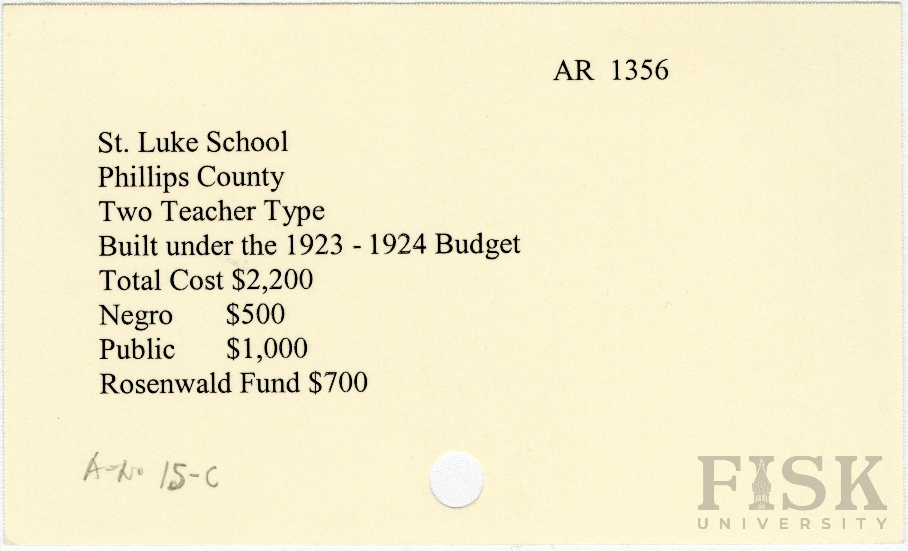 - School card from Rosenwald Fund for St. Luke School in Phillips County, Arkansas