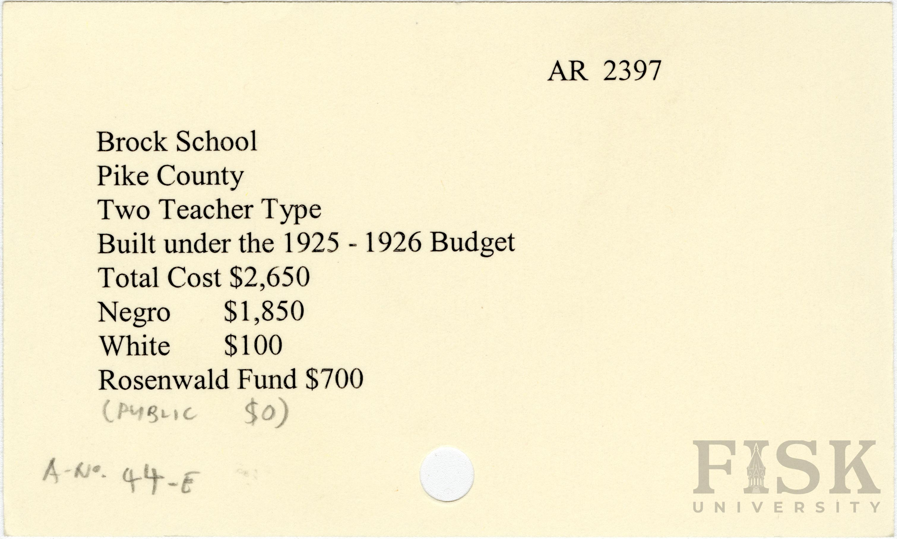 - School card from Rosenwald Fund for Brock School in Pike County, Arkansas