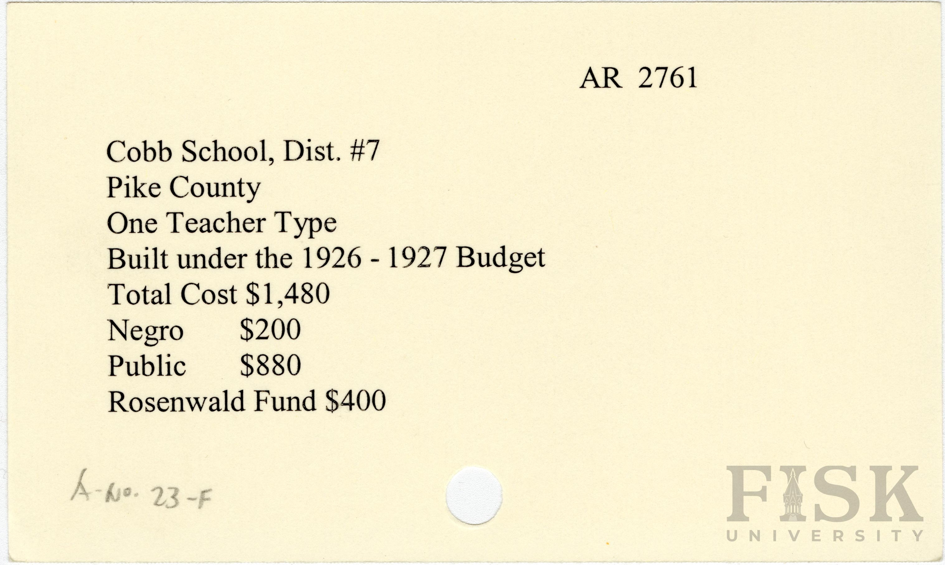 - School card from Rosenwald Fund for Cobb School in Pike County, Arkansas