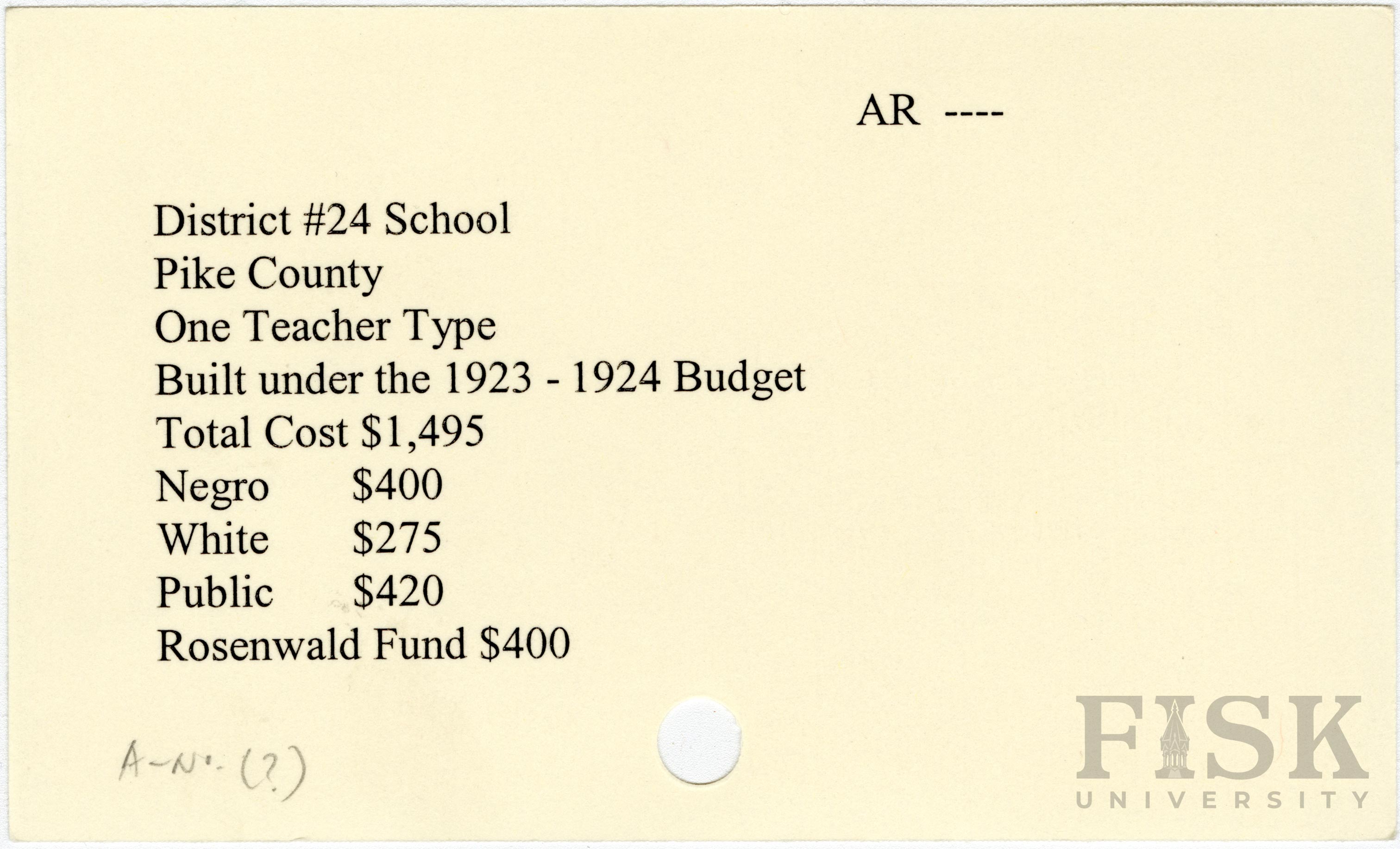 School card from Rosenwald Fund for District No. 24 School in Pike County, Arkansas