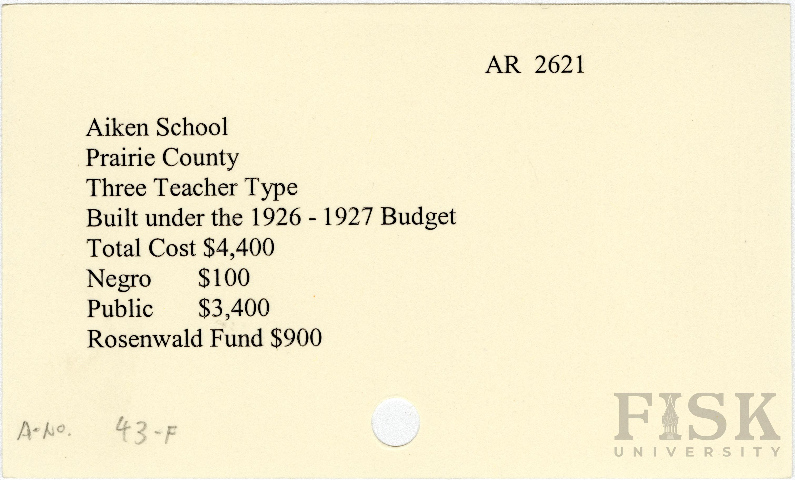 School card from Rosenwald Fund for Aiken School in Prairie County, Arkansas