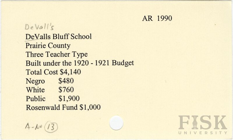 - School card from Rosenwald Fund for DeVall's Bluff School in Prairie County, Arkansas