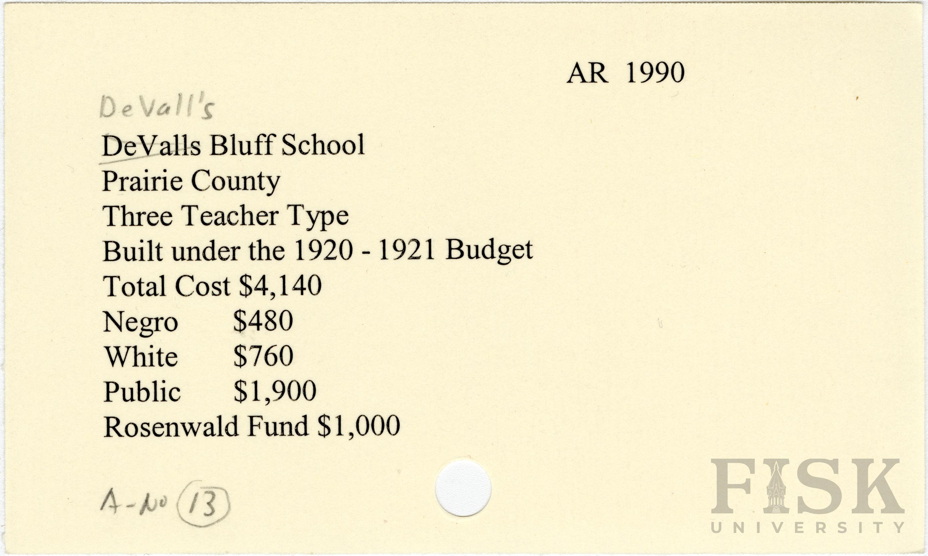School card from Rosenwald Fund for DeVall's Bluff School in Prairie County, Arkansas