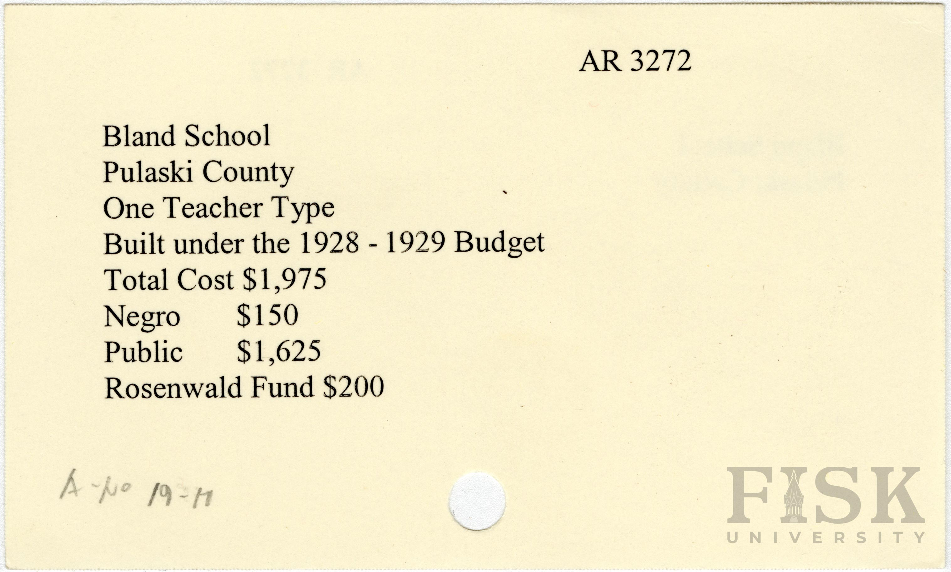 - School card from Rosenwald Fund for Bland School in Pulaski County, Arkansas