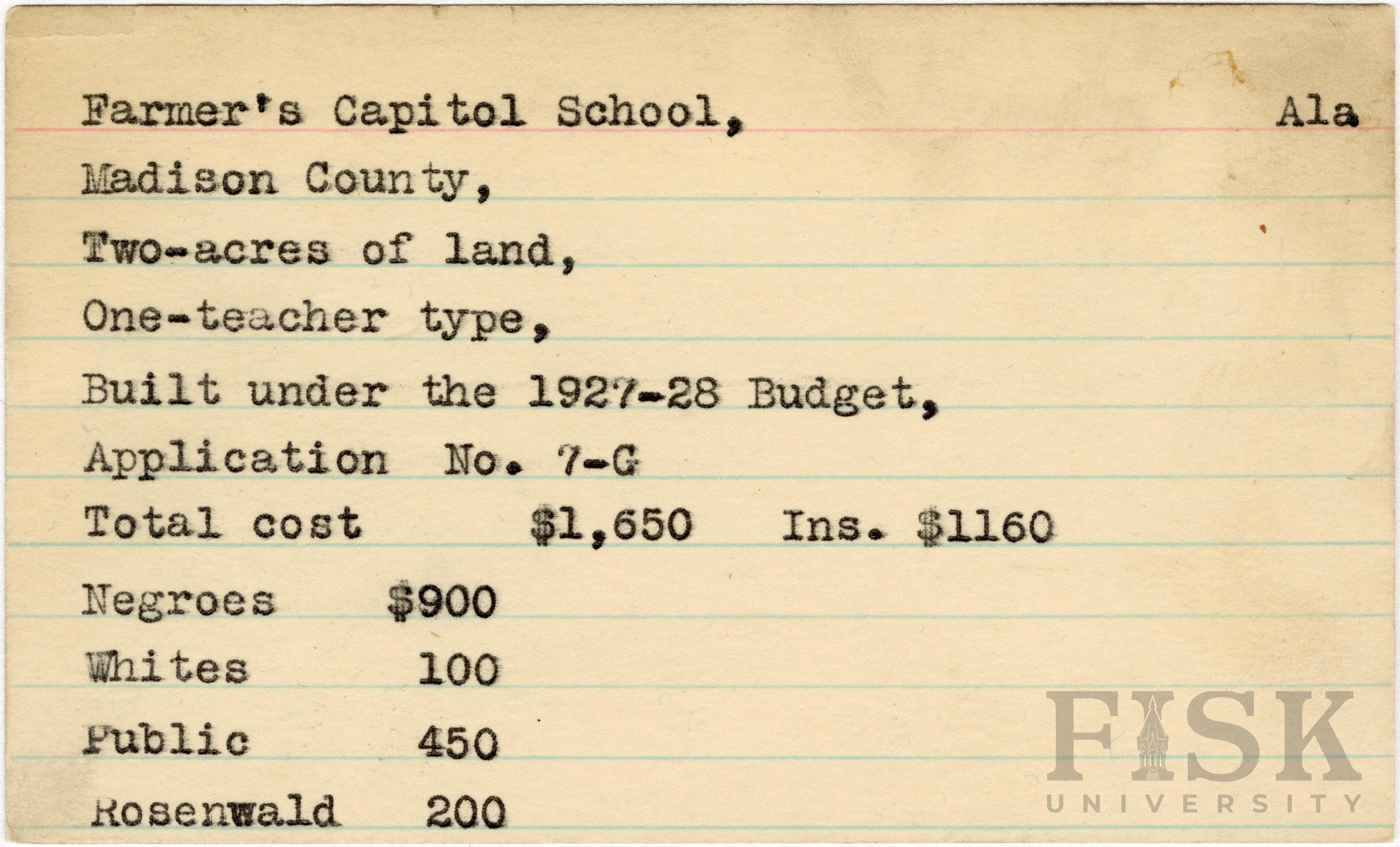 School card from Rosenwald Fund for Farmer's Capitol School in Madison County, Alabama with a section added to the budget contributions that says, "Ins. $1160"