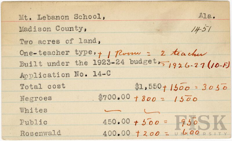 School card from Rosenwald Fund for Mt. Lebanon School in Madison County, Alabama with handwritten notes added to the teacher type, budget year, application number, and budget contribution sections