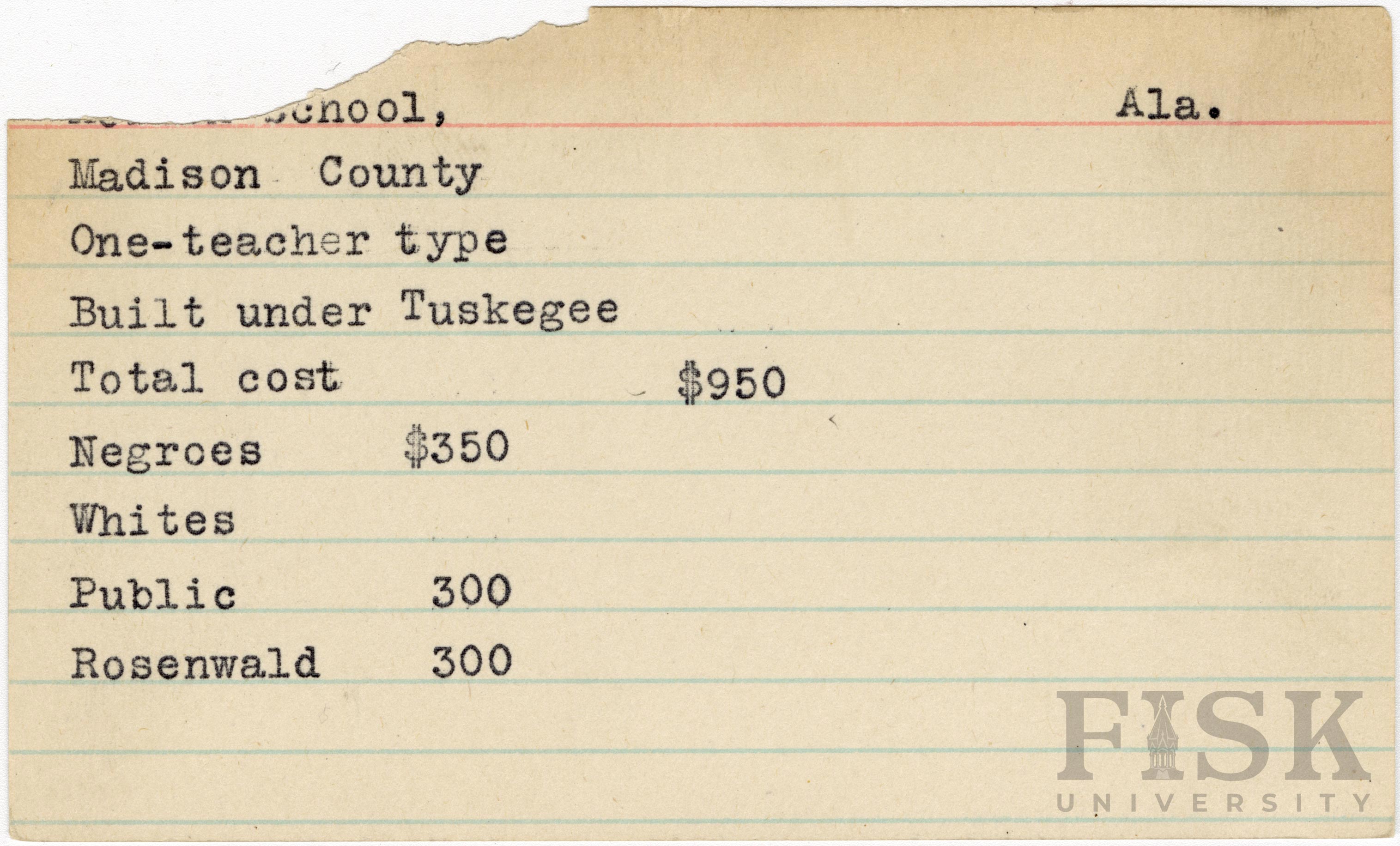 - School card from Rosenwald Fund for an unknown school in Madison County, Alabama. The top left corner where the school name is typed has been torn off.