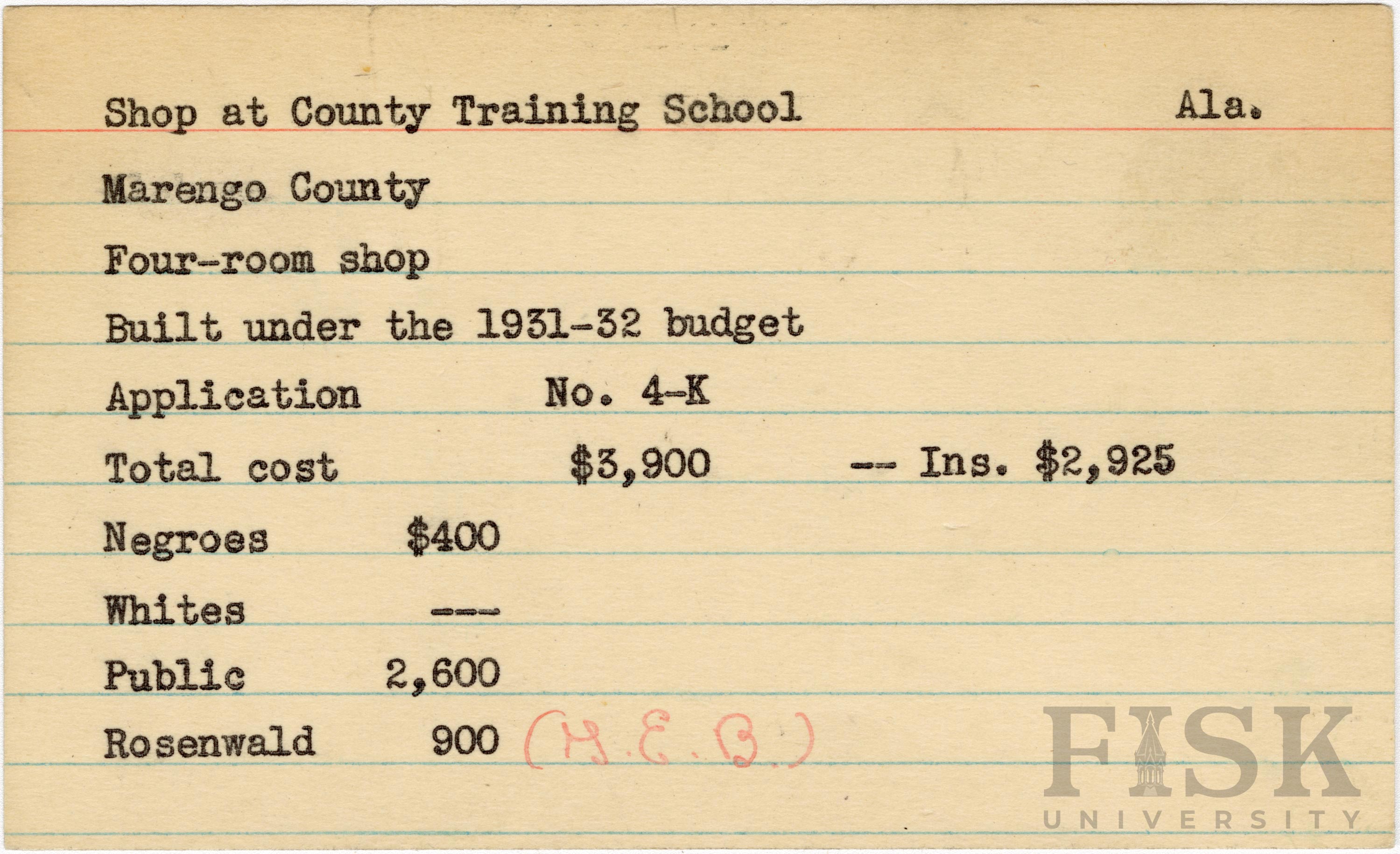 School card from Rosenwald Fund for County Training School in Marengo County, Alabama with a section added to the budget contributions that says, "Ins. $2,925" and "(G.E.B.)" handwritten next to the Rosenwald budget contribution section.