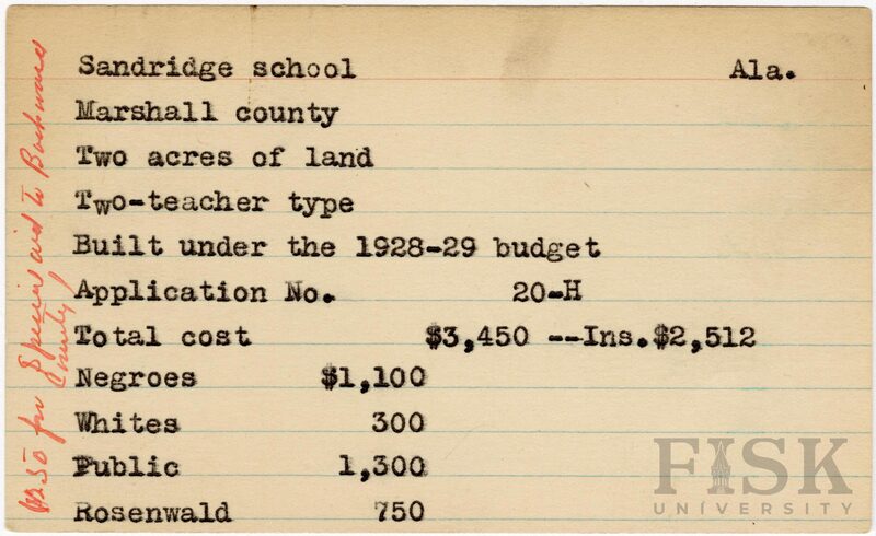 School card from Rosenwald Fund for Sandridge School in Marshall County, Alabama with a section added to the budget contributions that says, "Ins. $2,512" and a handwritten note on the far left of the card that says, "$250 for special aid to backward county".