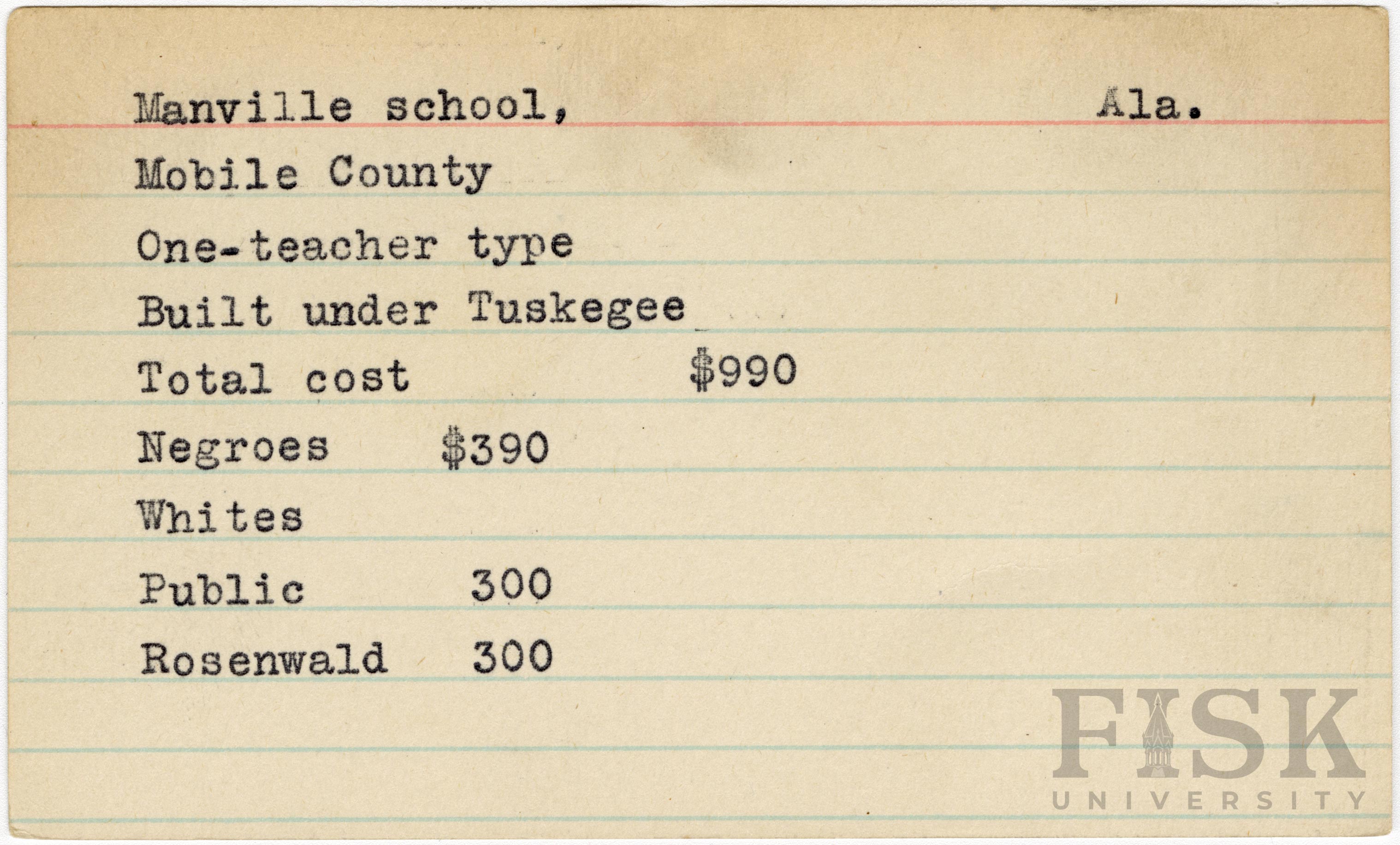 - School card from Rosenwald Fund for Manville School in Mobile County, Alabama