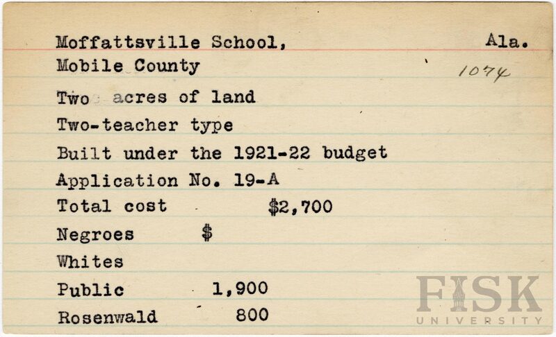School card from Rosenwald Fund for Moffattsville School in Mobile County, Alabama