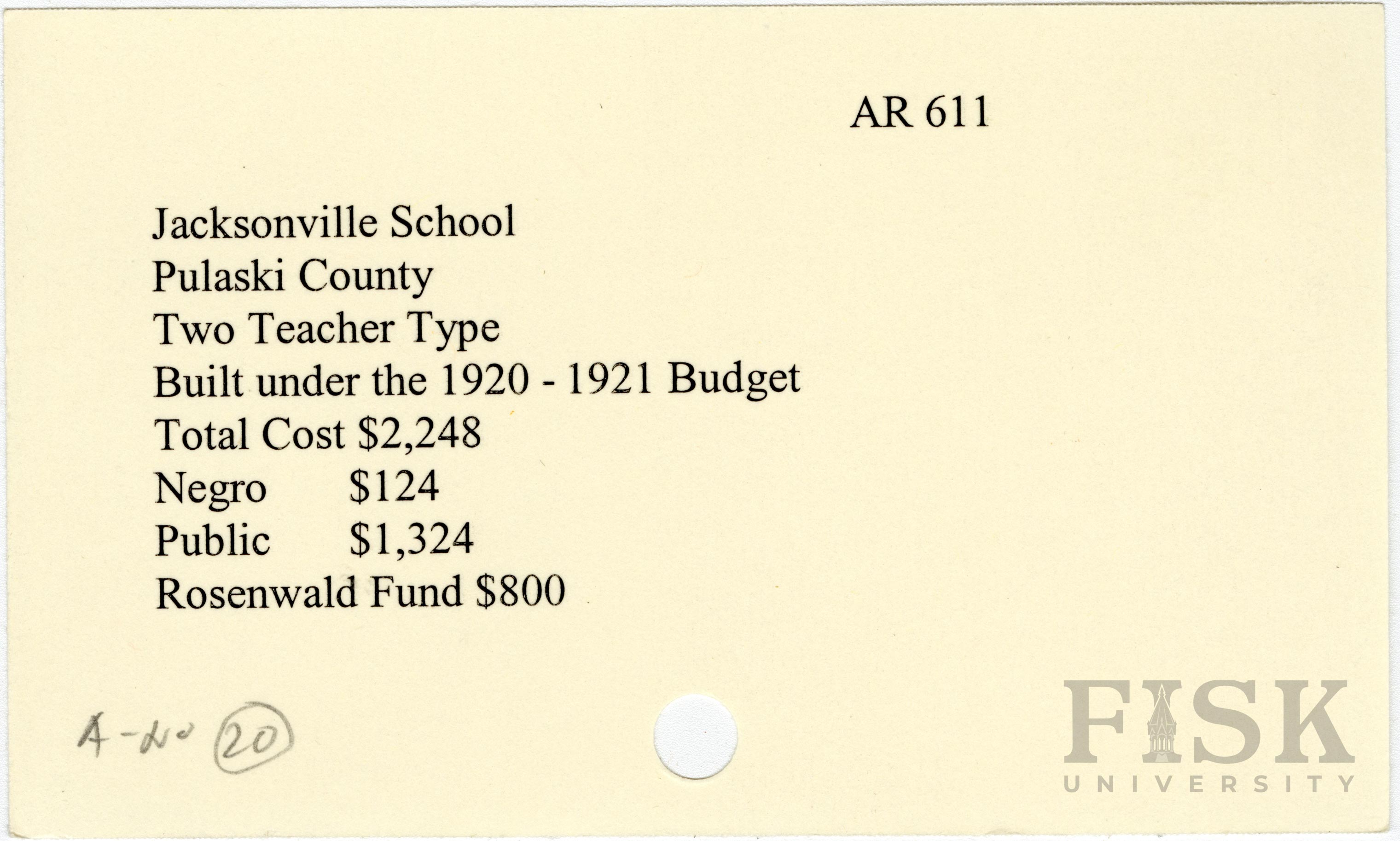 - School card from Rosenwald Fund for Jacksonville School in Pulaski County, Arkansas