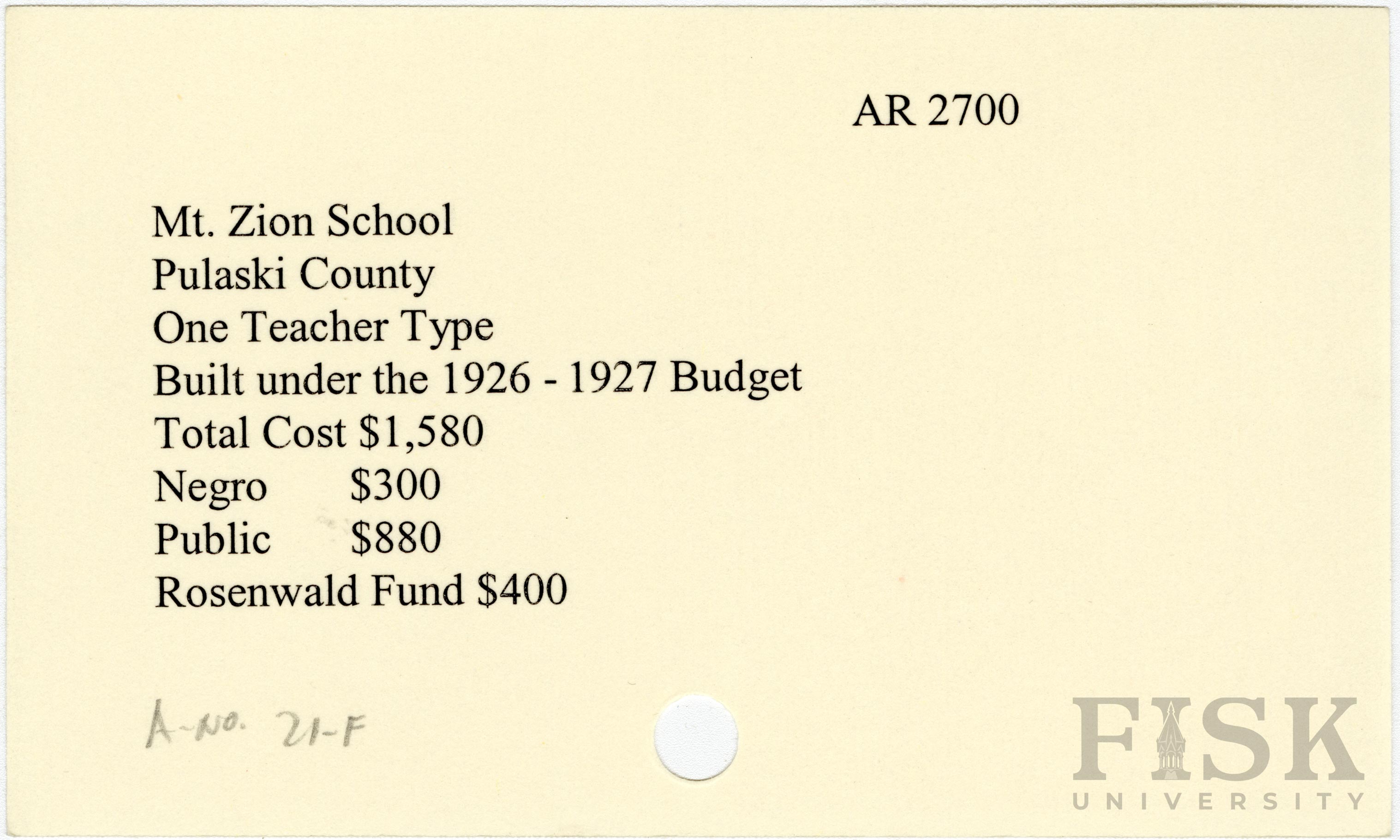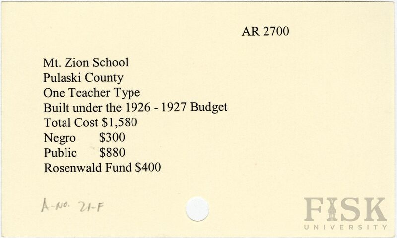 - School card from Rosenwald Fund for Mt. Zion School in Pulaski County, Arkansas