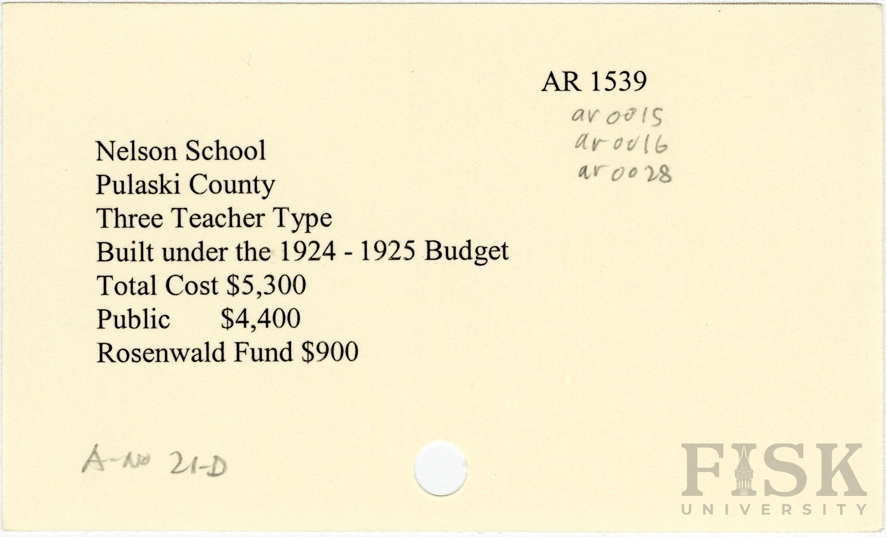 - School card from Rosenwald Fund for Nelson School in Pulaski County, Arkansas