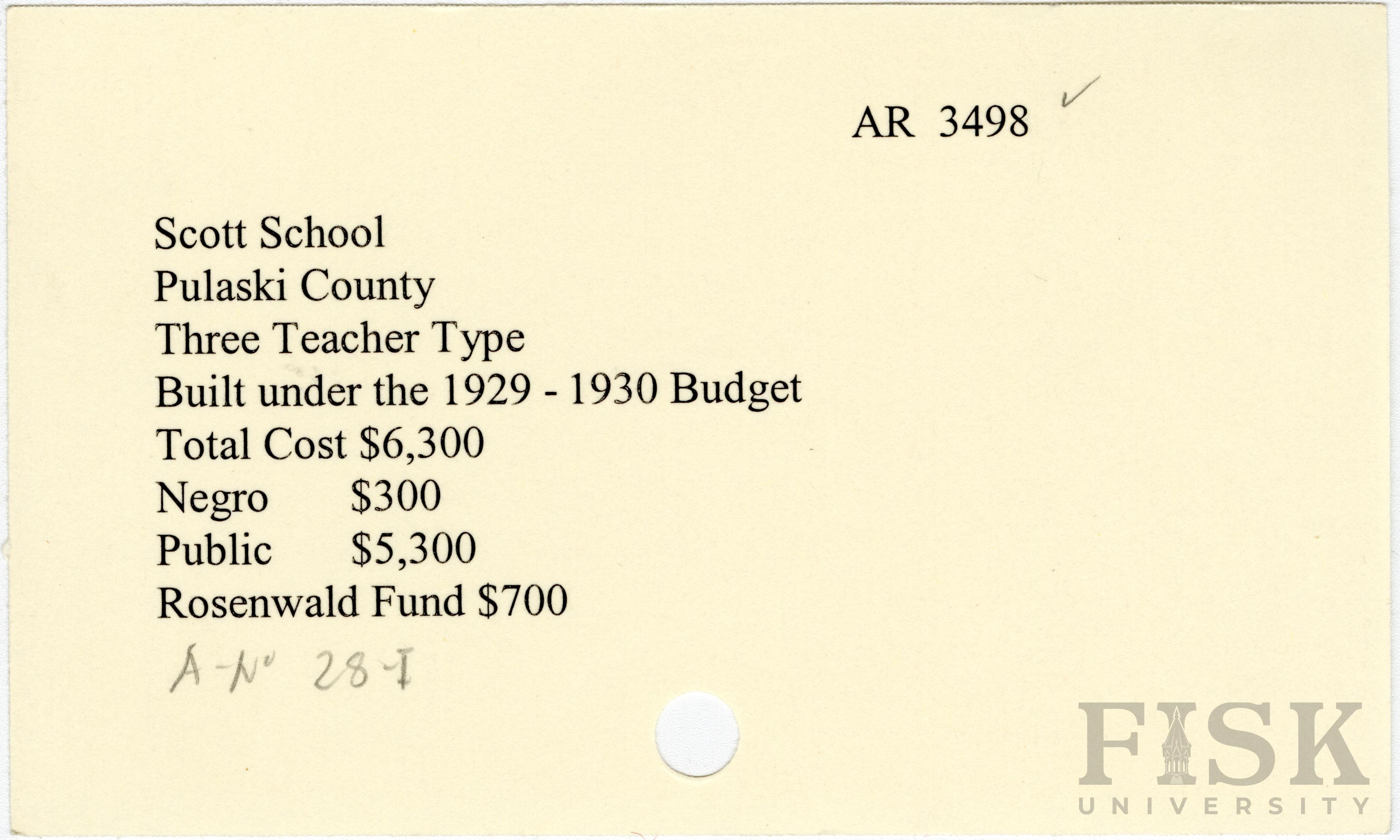- School card from Rosenwald Fund for Scott School in Pulaski County, Arkansas