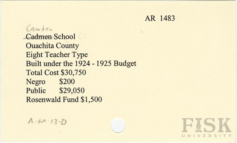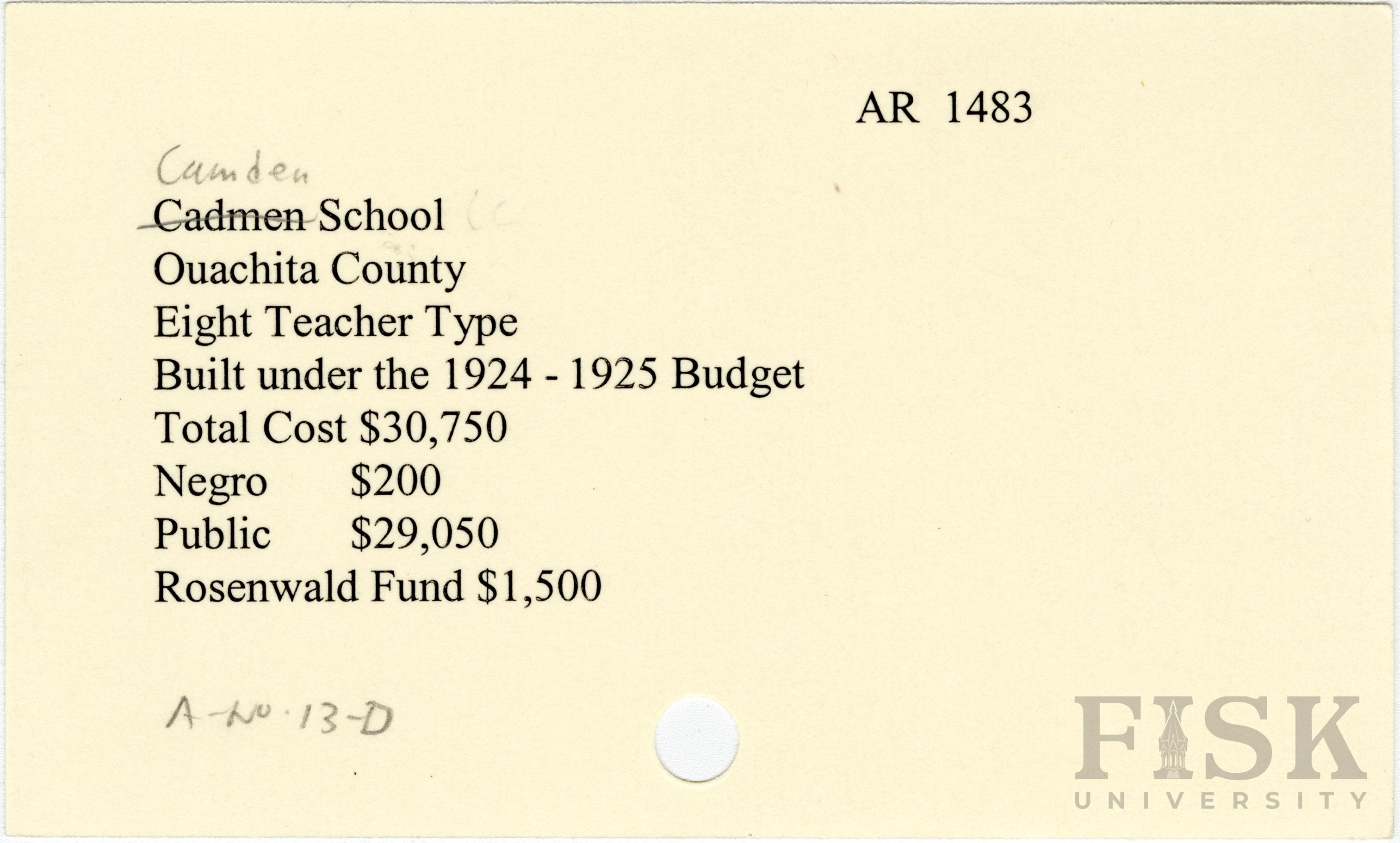 - School card from Rosenwald Fund for Camden School in Ouachita County, Arkansas with a handwritten correction to the school name