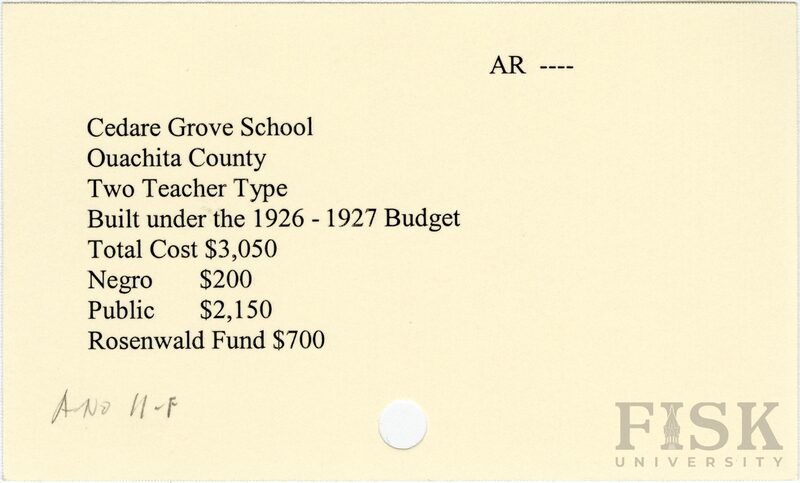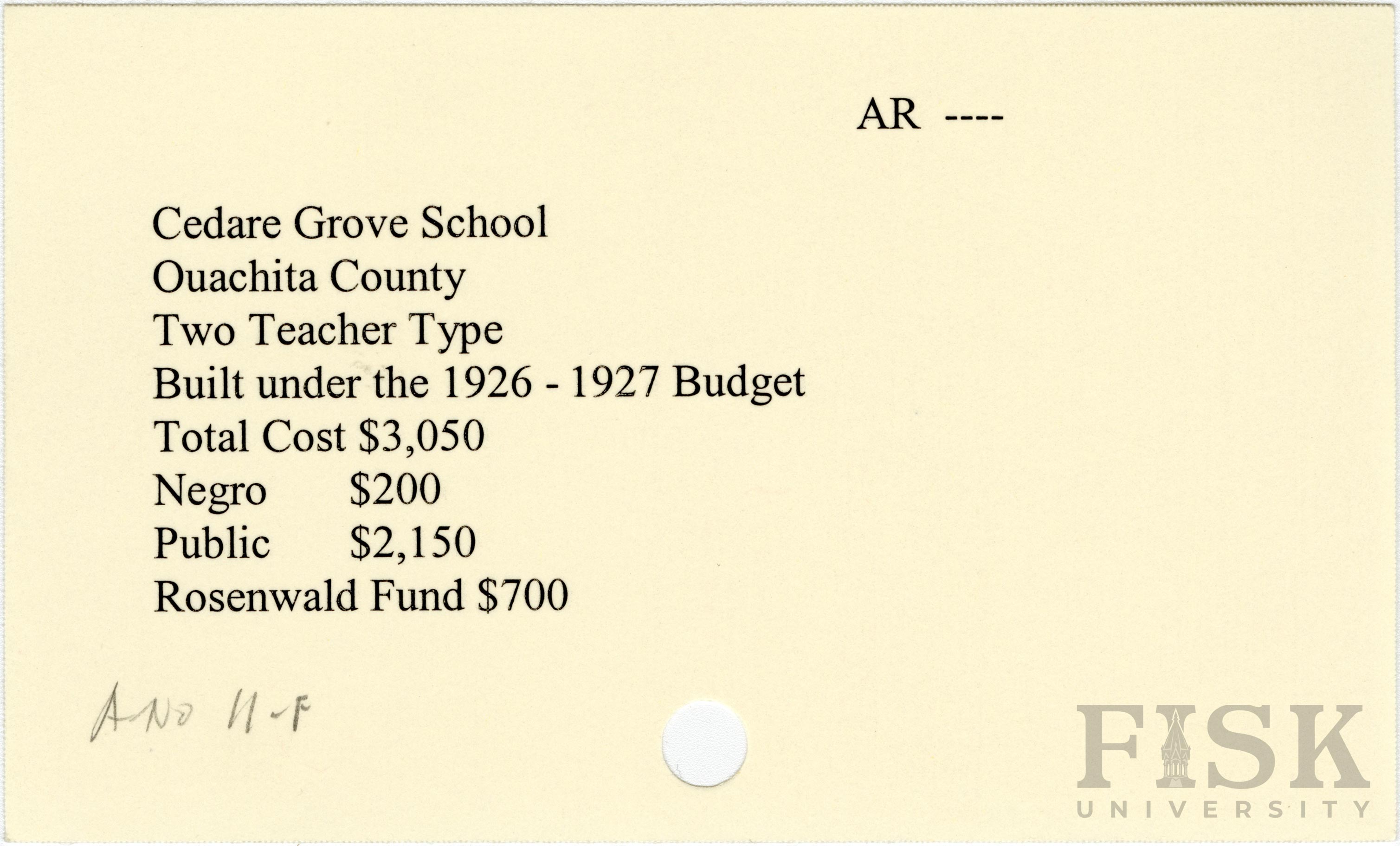 - School card from Rosenwald Fund for Cedare Grove School in Ouachita County, Arkansas