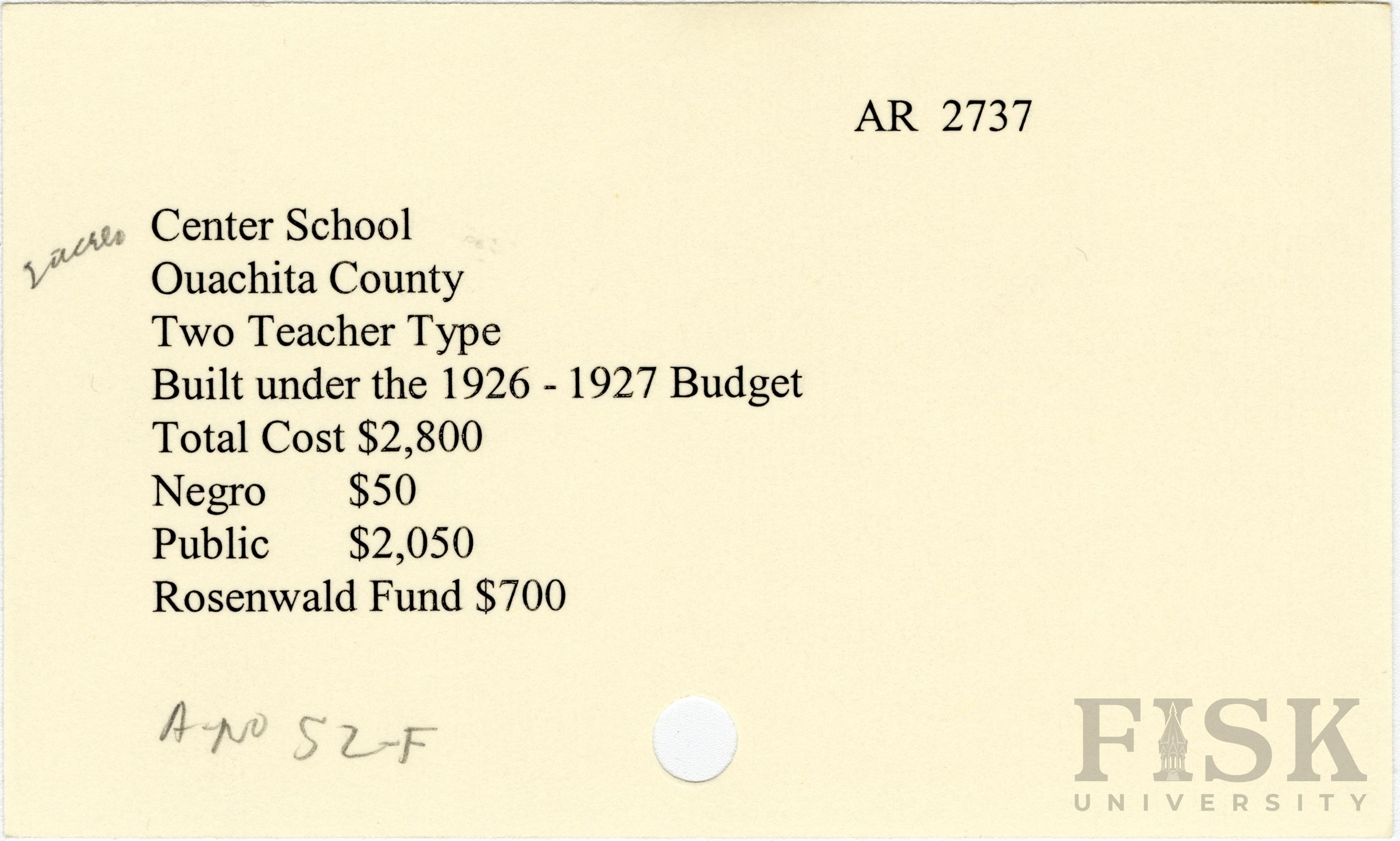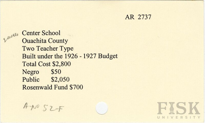 - School card from Rosenwald Fund for Center School in Ouachita County, Arkansas