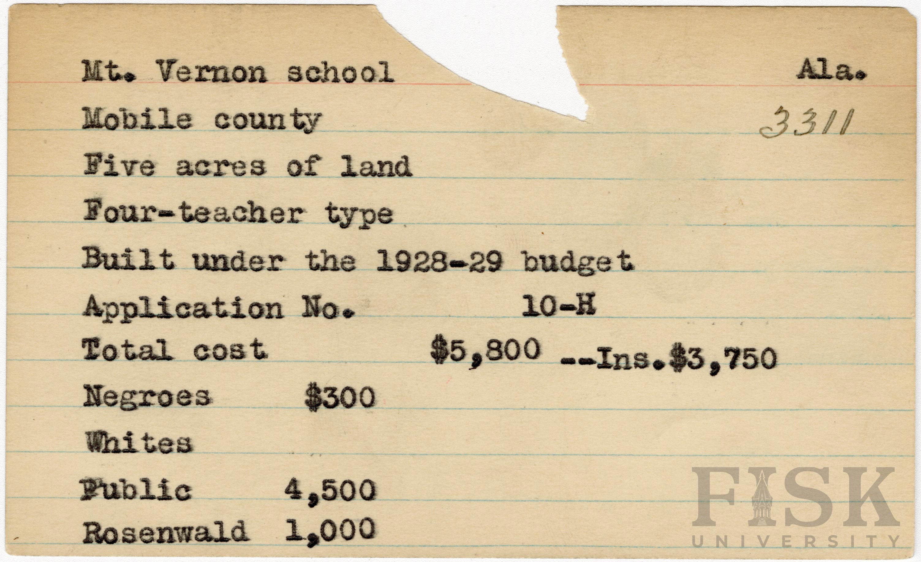 - School card from Rosenwald Fund for Mt. Vernon School in Mobile County, Alabama with a section added to the budget contributions that says, "Ins. $3,750"