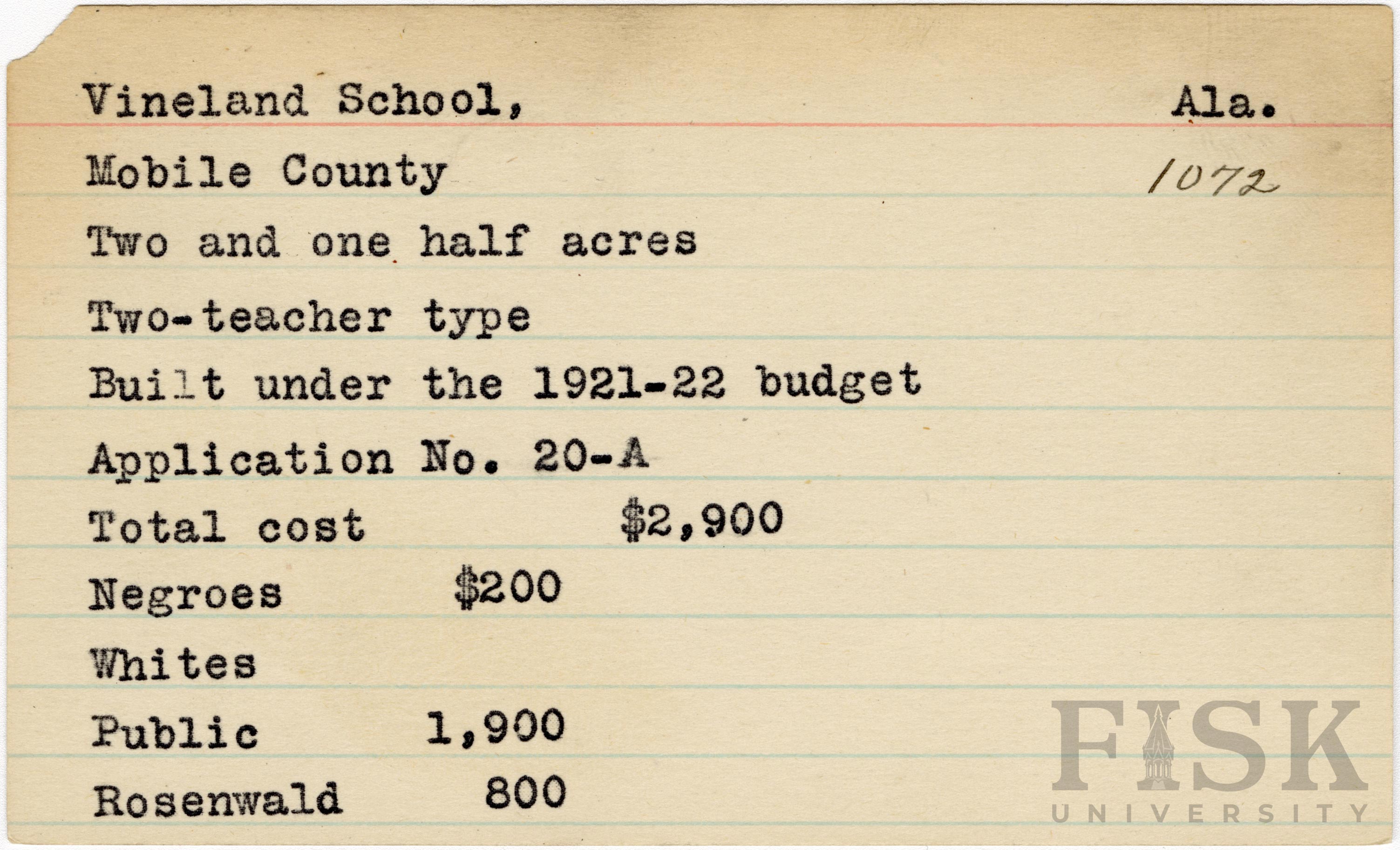 - School card from Rosenwald Fund for Vineland School in Mobile County, Alabama
