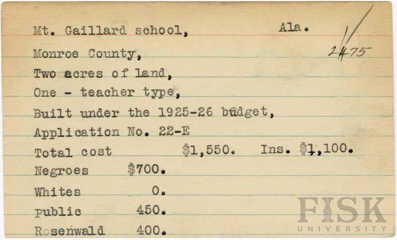 - School card from Rosenwald Fund for Mt. Gaillard School in Monroe County, Alabama with a section added to the budget contributions that says, "Ins. $1,100"