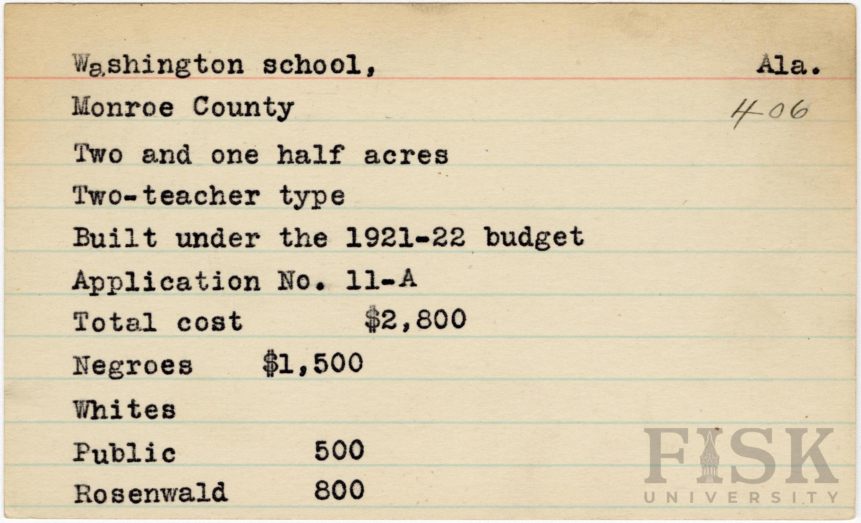 - School card from Rosenwald Fund for Washington School in Monroe County, Alabama