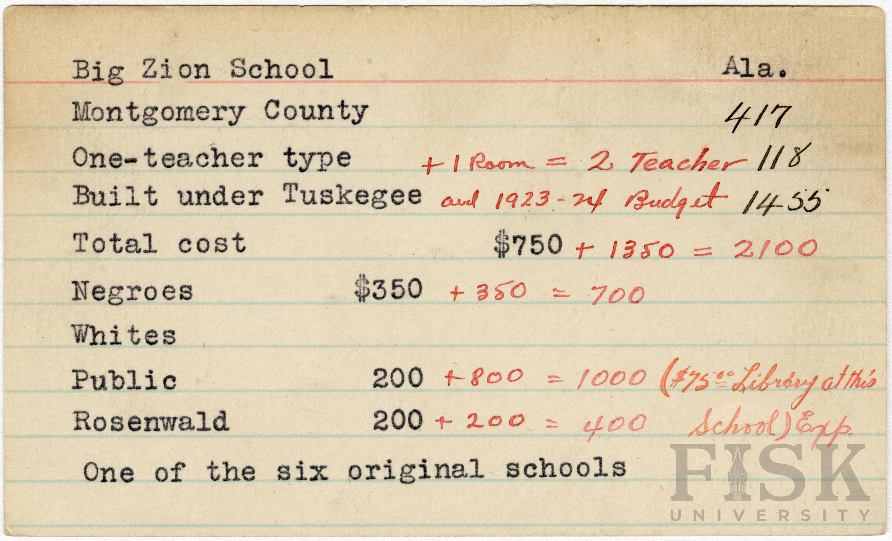 - School card from Rosenwald Fund for Big Zion School in Montgomery County, Alabama with handwritten additions to the teacher type, budget year, and budget contribution sections. A handwritten note says "($75.00 library at this school) Exp.". Another note on the bottom says, "One of the six original schools".
