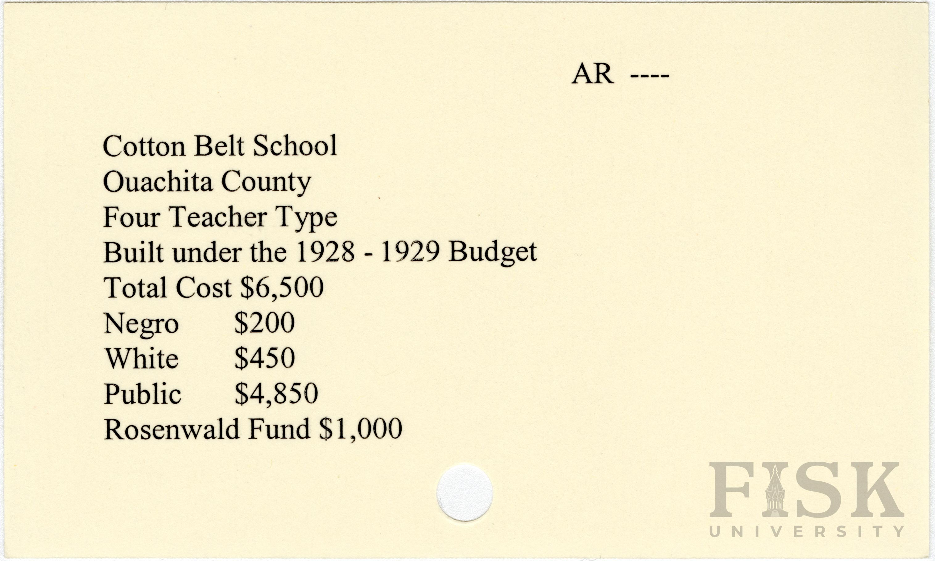 - School card from Rosenwald Fund for Cotton Belt School in Ouachita County, Arkansas
