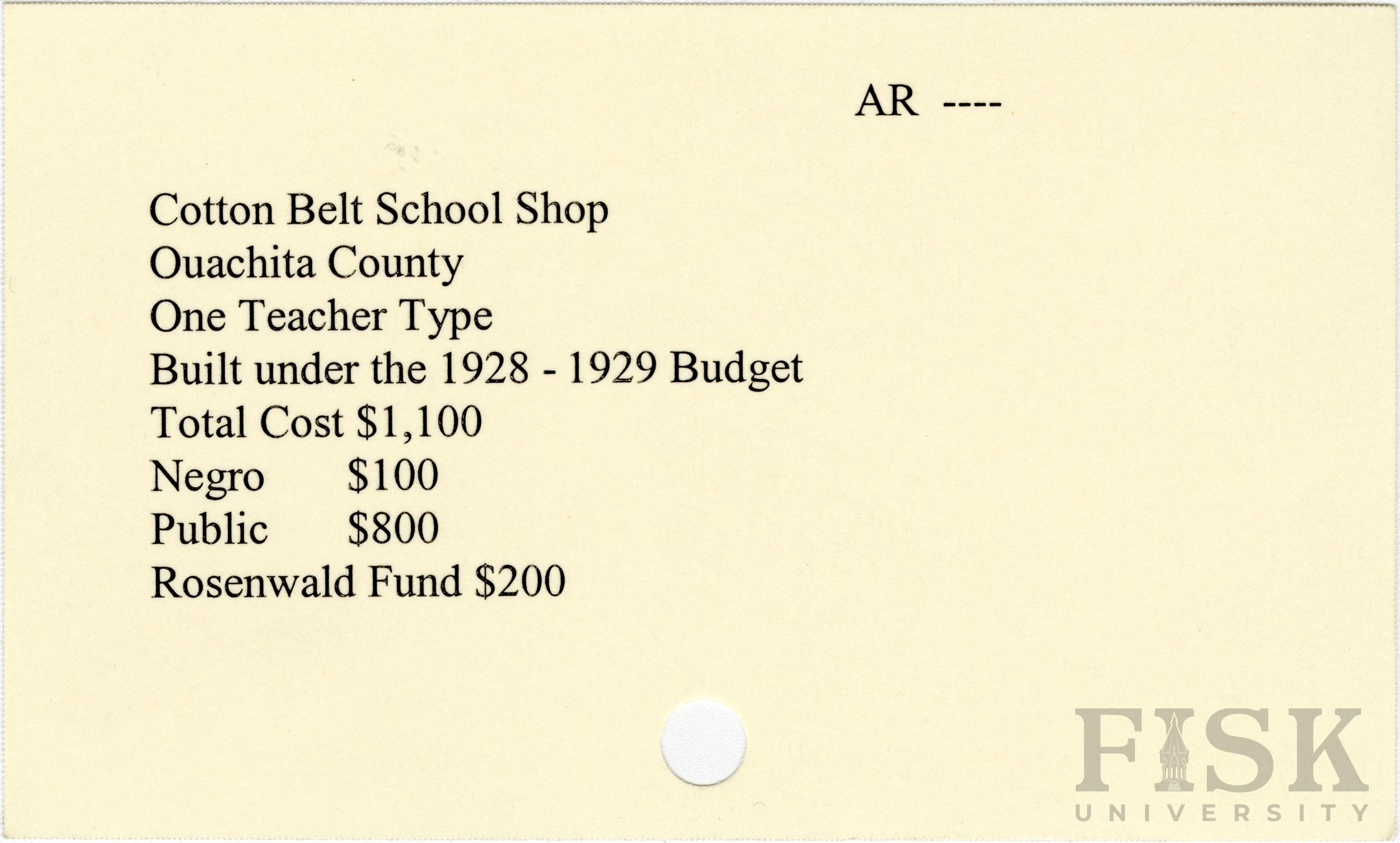 - School card from Rosenwald Fund for the school shop at Cotton Belt School in Ouachita County, Arkansas