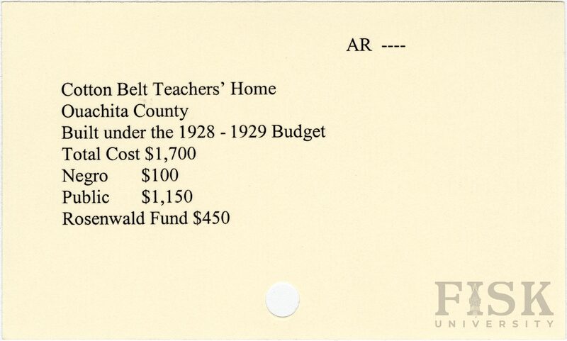 - School card from Rosenwald Fund for the teacher's home at Cotton Belt School in Ouachita County, Arkansas