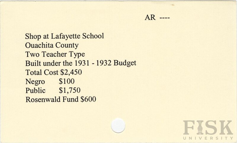 - School card from Rosenwald Fund for the shop at Lafayette School in Ouachita County, Arkansas