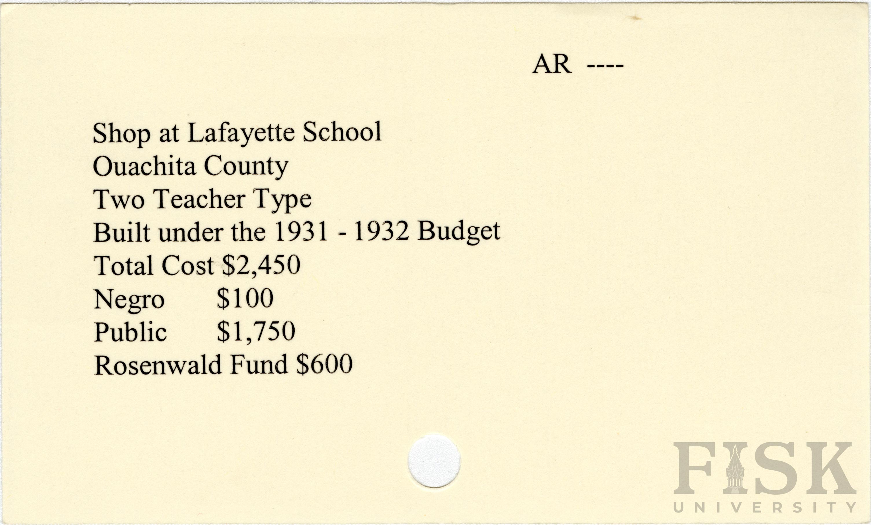 School card from Rosenwald Fund for the shop at Lafayette School in Ouachita County, Arkansas